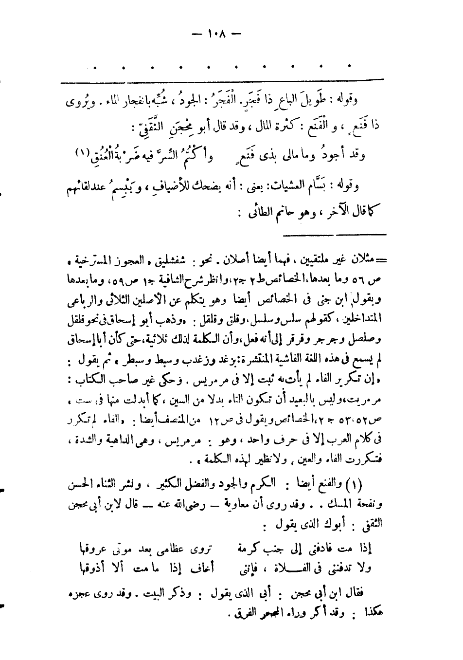 وَقَوْلُهُ: طَوِيلَ الْبَاعِ ذَا فَجَرٍ. الْفَجَرُ: الْجُودُ، شُبّهَ بِانْفِجَارِ الْمَاءِ. وَيُرْوَى ذَا فَنَعٍ، وَالْفَنَعُ: كَثْرَةُ الْمَالِ، وَقَدْ قَالَ أَبُو مِحْجَنٍ الثّقَفِيّ: