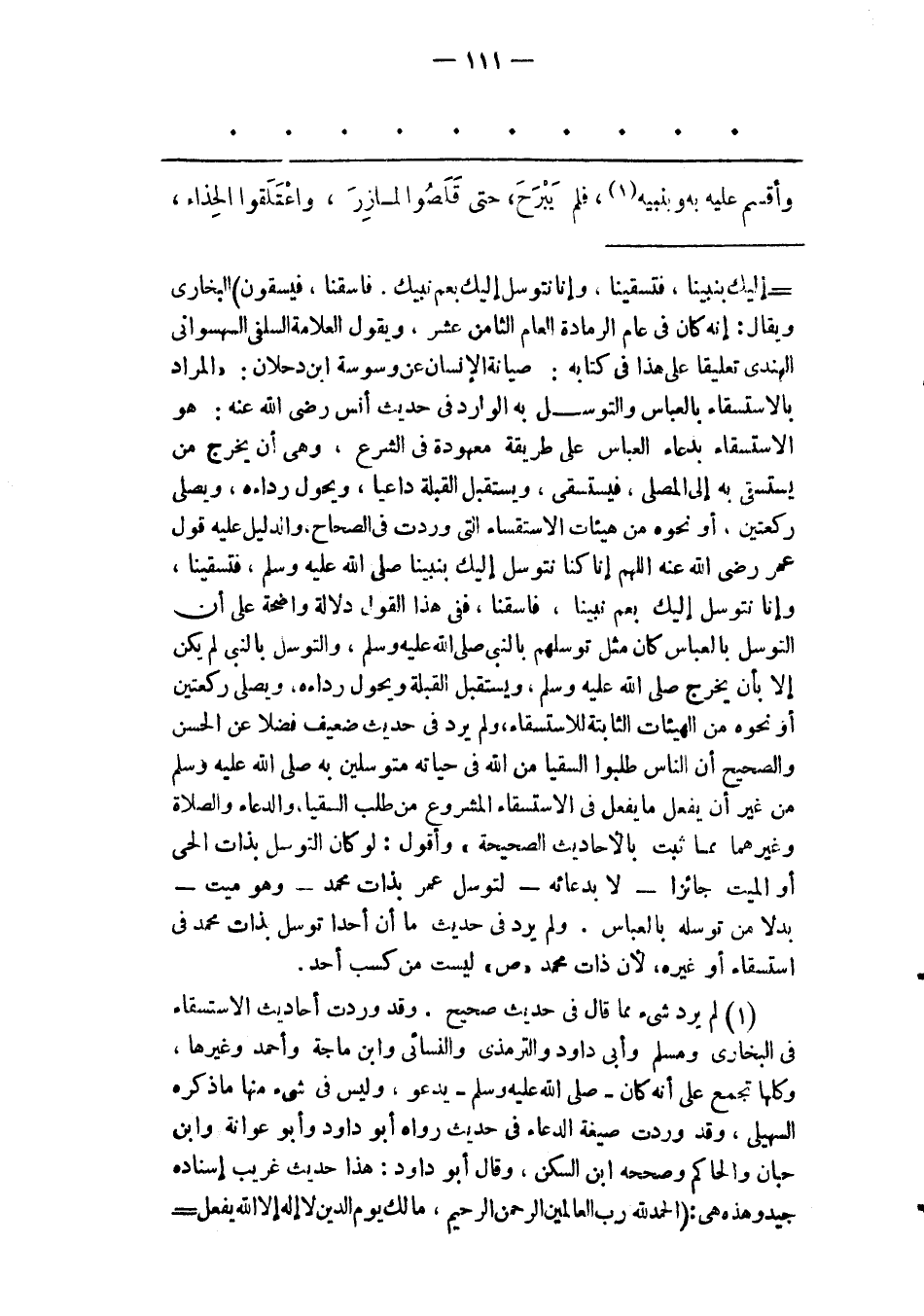 - إليك بنبينا، فتسقينا، وإنا نتوسل إليك بعم نبيك. فاسقنا، فيسقون) البخارى ويقال: إنه كان فى عام الرمادة العام الثامن عشر، ويقول العلامة السلفى السهسوانى الهندى تعليقا على هذا فى كتابه: صيانة الإنسان عن وسوسة ابن دحلان: «المراد بالاستسقاء بالعباس والتوسل به الوارد فى حديث أنس رضى الله عنه: هو الاستسقاء بدعاء العباس على طريقة معهودة فى الشرع، وهى أن يخرج من يستسقى به إلى المصلى، فيستسقى، ويستقبل القبلة داعيا، ويحول رداءه، ويصلى ركعتين، أو نحوه من هيئات الاستقساء التى وردت فى الصحاح، والدليل عليه قول عمر رضى الله عنه اللهم إنا كنا نتوسل إليك بنبينا صلّى الله عليه وسلم، فتسقينا، وإنا نتوسل إليك بعم نبينا، فاسقنا، ففى هذا القول دلالة واضحة على أن التوسل بالعباس كان مثل توسلهم بالنبى صلّى الله عليه وسلم، والتوسل بالنبى لم يكن إلا بأن يخرج صلّى الله عليه وسلم، ويستقبل القبلة ويحول رداءه، ويصلّى ركعتين أو نحوه من الهيئات الثابتة للاستسقاء، ولم يرد فى حديث ضعيف فضلا عن الحسن والصحيح أن الناس طلبوا السقيا من الله فى حياته متوسلين به صلّى الله عليه وسلم من غير أن يفعل ما يفعل فى الاستسقاء المشروع من طلب السقيا، والدعاء والصلاة وغيرهما مما ثبت بالأحاديث الصحيحة» وأقول: لو كان التوسل بذات الحى أو الميت جائزا- لا بدعائه- لتوسل عمر بذات محمد- وهو ميت- بدلا من توسله بالعباس. ولم يرد فى حديث ما أن أحدا توسل بذات محمد فى استسقاء أو غيره، لأن ذات محمد «ص» ليست من كسب أحد.