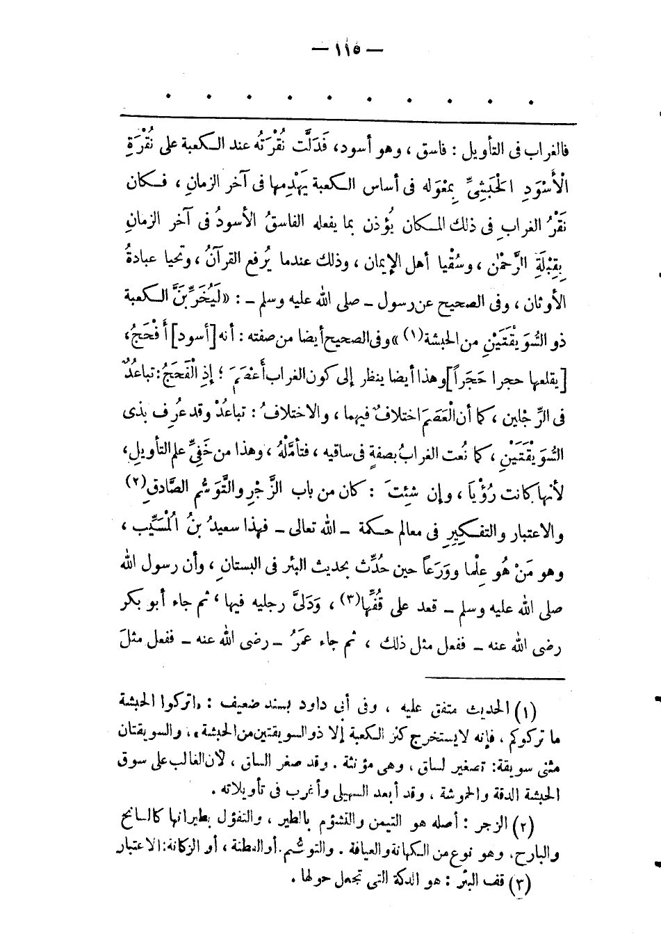 فَالْغُرَابُ فِي التّأْوِيلِ: فَاسِقٌ، وَهُوَ أَسْوَدُ، فَدَلّتْ نُقْرَتُهُ عِنْدَ الْكَعْبَةِ عَلَى نُقْرَةِ الْأَسْوَدِ الْحَبَشِيّ بِمِعْوَلِهِ فِي أَسَاسِ الْكَعْبَةِ يَهْدِمُهَا فِي آخِرِ الزّمَانِ، فَكَانَ نَقْرُ الْغُرَابِ فِي ذَلِكَ الْمَكَانِ يُؤْذِنُ بِمَا يَفْعَلُهُ الْفَاسِقُ الْأَسْوَدُ فِي آخِرِ الزّمَانِ بِقِبْلَةِ الرّحْمَنِ، وَسُقْيَا أَهْلِ الْإِيمَانِ، وَذَلِكَ عِنْدَمَا يُرْفَعُ الْقُرْآنُ، وَتُحْيَا عِبَادَةُ الْأَوْثَانِ، وَفِي الصحيح عن رسول- صَلَّى اللَّهُ عَلَيْهِ وَسَلَّمَ-: «لَيُخَرّبَنّ الْكَعْبَةَ ذُو السّوَيْقَتَيْنِ مِنْ الْحَبَشَةِ «1» » وَفِي الصّحِيحِ أَيْضًا مِنْ صِفَتِهِ: أَنّهُ [أَسْوَدُ] أَفْحَجُ، [يَقْلَعُهَا حَجَرًا حَجَرًا] وَهَذَا أَيْضًا يَنْظُرُ إلَى كَوْنِ الْغُرَابِ أَعْصَمَ؛ إذْ الْفَحَجُ: تَبَاعُدٌ فِي الرّجْلَيْنِ، كَمَا أَنّ الْعَصَمَ اخْتِلَافٌ فِيهِمَا، وَالِاخْتِلَافُ: تَبَاعُدٌ وَقَدْ عُرِفَ بِذِي السّوَيْقَتَيْنِ، كَمَا نُعِتَ الْغُرَابُ بِصِفَةِ فِي سَاقَيْهِ، فَتَأَمّلْهُ، وَهَذَا مِنْ خَفِيّ عِلْمِ التّأْوِيلِ، لِأَنّهَا كَانَتْ رُؤْيَا، وَإِنْ شِئْت: كَانَ مِنْ بَابِ الزّجْرِ وَالتّوَسّمِ الصّادِقِ «2» وَالِاعْتِبَارِ وَالتّفْكِيرِ فِي مَعَالِمِ حِكْمَةِ- اللهِ تَعَالَى- فَهَذَا سَعِيدُ بْنُ الْمُسَيّبِ، وَهُوَ مَنْ هُوَ عِلْمًا وَوَرَعًا حِينَ حُدّثَ بِحَدِيثِ الْبِئْرِ فِي الْبُسْتَانِ، وَأَنّ رَسُولَ اللهِ صَلَّى اللَّهُ عَلَيْهِ وَسَلَّمَ- قَعَدَ عَلَى قفّها «3» ، ودلىّ رجليه فيها، ثم جاء أبوبكر رضي الله عنه- ففعل مثل ذلك، ثم جَاءَ عُمَرُ- رَضِيَ الله عَنْهُ- فَفَعَلَ مِثْلَ