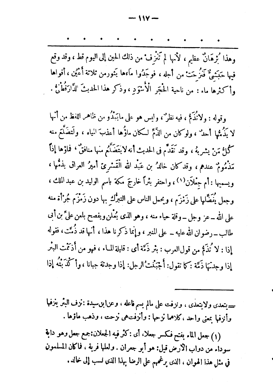 وَقَوْلُهُ: وَلَا تُذَمّ، فِيهِ نَظَرٌ، وَلَيْسَ هُوَ عَلَى مَا يَبْدُو مِنْ ظَاهِرِ اللّفْظِ مِنْ أَنّهَا لَا يَذُمّهَا أَحَدٌ، وَلَوْ كَانَ مِنْ الذّمّ لَكَانَ مَاؤُهَا أَعْذَبَ الْمِيَاهِ، وَلَتَضَلّعَ مِنْهُ كُلّ مَنْ يَشْرَبُهُ، وَقَدْ تَقَدّمَ فِي الْحَدِيثِ أَنّهُ لَا يَتَضَلّعُ مِنْهَا مُنَافِقٌ، فَمَاؤُهَا إذًا مَذْمُومٌ عِنْدَهُمْ، وَقَدْ كَانَ خَالِدُ بْنُ عَبْدِ اللهِ الْقَسْرِيّ أَمِيرَ الْعِرَاقِ يَذُمّهَا، وَيُسَمّيهَا: أُمّ جِعْلَانَ «1» ، وَاحْتَفَرَ بِئْرًا خَارِجَ مَكّةَ بِاسْمِ الْوَلِيدِ بْنِ عَبْدِ الْمَلِكِ، وَجَعَلَ يُفَضّلُهَا عَلَى زَمْزَمَ، وَيَحْمِلُ النّاسَ عَلَى التّبَرّكِ بِهَا دُونَ زَمْزَمَ جُرْأَةً مِنْهُ عَلَى اللهِ- عَزّ وَجَلّ- وَقِلّةَ حِيَاءٍ مِنْهُ، وَهُوَ الّذِي يُعْلِنُ وَيُفْصِحُ بِلَعْنِ عَلِيّ بْنِ أَبِي طَالِبٍ- رِضْوَانُ اللهِ عَلَيْهِ- عَلَى الْمِنْبَرِ، وَإِنّمَا ذَكَرْنَا هَذَا، أَنّهَا قَدْ ذُمّتْ، فَقَوْلُهُ إذًا: لَا تُذَمّ مِنْ قَوْلِ الْعَرَبِ: بِئْرٌ ذَمّةٌ أَيْ: قَلِيلَةُ الْمَاءِ، فَهُوَ مِنْ أَذْمَمْتَ الْبِئْرَ إذَا وَجَدْتهَا ذَمّةً: كَمَا تَقُولُ: أَجْبَنْت الرّجُلَ: إذَا وَجَدْته جَبَانًا، وأكذبته إذا