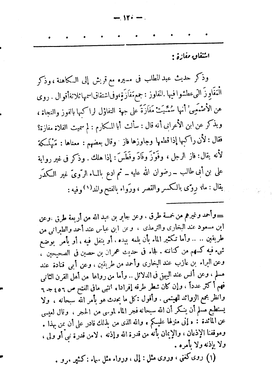 وَذَكَرَ حَدِيثَ عَبْدِ الْمُطّلِبِ فِي مَسِيرِهِ مَعَ قُرَيْشٍ إلَى الْكَاهِنَةِ، وَذَكَرَ الْمَفَاوِزَ الّتِي عَطِشُوا فِيهَا. الْمَفَاوِزُ: جَمْعُ مَفَازَةٍ، وَفِي اشْتِقَاقِ اسْمِهَا ثَلَاثَةُ أَقْوَالٍ. رُوِيَ عَنْ الْأَصْمَعِيّ أَنّهَا سُمّيَتْ مَفَازَةً عَلَى جِهَةِ التّفَاؤُلِ لِرَاكِبِهَا بِالْفَوْزِ وَالنّجَاةِ، وَيُذْكَرُ عَنْ ابْنِ الْأَعْرَابِيّ أَنّهُ قَالَ: سَأَلْت أَبَا الْمَكَارِمِ: لِمَ سُمّيَتْ الْفَلَاةُ مَفَازَةً؟