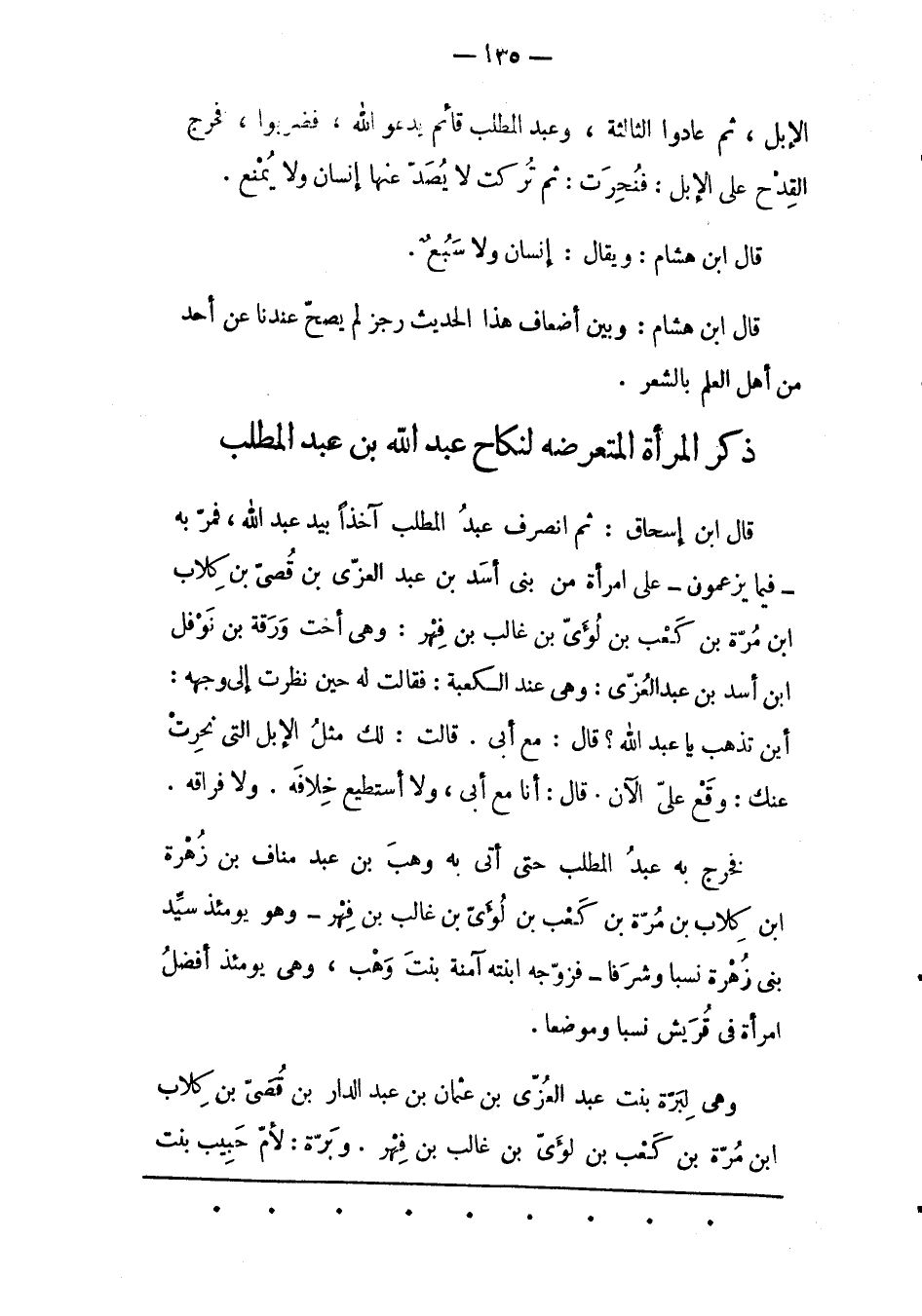 قَالَ ابْنُ إسْحَاقَ: ثُمّ انْصَرَفَ عَبْدُ الْمُطّلِبِ آخِذًا بِيَدِ عَبْدِ اللهِ، فَمَرّ بِهِ- فِيمَا يزعمون- على امرأة مِنْ بَنِي أَسَدِ بْنِ عَبْدِ الْعُزّى بْنِ قصىّ بن كلاب ابن مرة بن كعب بن لؤي بن غالب بْنِ فِهْرِ: وَهِيَ أُخْتُ وَرَقَةَ بْنِ نَوْفَلِ ابن أَسَدِ بْنِ عَبْدِ الْعُزّى: وَهِيَ عِنْدَ الْكَعْبَة: فَقَالَتْ لَهُ حِينَ نَظَرَتْ إلَى وَجْهِهِ: