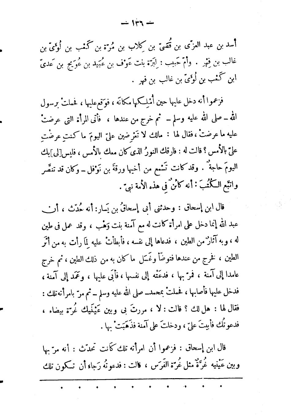 فَزَعَمُوا أَنّهُ دَخَلَ عَلَيْهَا حِينَ أُمْلِكَهَا مَكَانَهُ، فَوَقَعَ عَلَيْهَا، فَحَمَلَتْ بِرَسُولِ اللهِ- صَلّى اللهُ عَلَيْهِ وَسَلّمَ- ثُمّ خَرَجَ مِنْ عِنْدِهَا، فَأَتَى المرأة التى عرضت عليه ما عرضت، فقال لها: مالك لَا تَعْرِضِينَ عَلَيّ الْيَوْمَ مَا كُنْتِ عَرَضْتِ عَلَيّ بِالْأَمْسِ؟ قَالَتْ لَهُ: فَارَقَك النّورُ الّذِي كَانَ مَعَك بِالْأَمْسِ، فَلَيْسَ [لِي] بِك الْيَوْمَ حَاجَةٌ. وَقَدْ كَانَتْ تَسْمَعُ مِنْ أَخِيهَا وَرَقَةَ بْنِ نَوْفَلٍ- وَكَانَ قَدْ تَنَصّرَ وَاتّبَعَ الْكُتُبَ: أنه كائن فِي هَذِهِ الْأُمّةِ نَبِيّ.