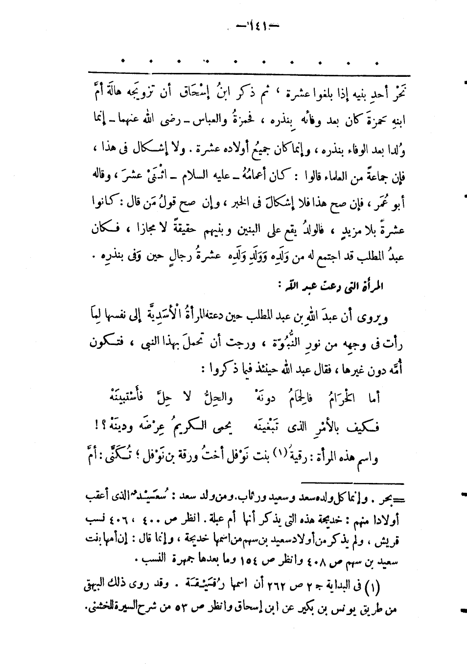 - بحر. وإنما كل ولده سعد وسعيد ورئاب. ومن ولد سعد: سعيد الذى أعقب أولادا منهم: خديجة هذه التى يذكر أنها أم عبلة. انظر ص 400، 406 نسب قريش، ولم يذكر من أولاد سعيد بن سهم من اسمها خديجة، وإنما قال: إن أمها بنت سعيد بن سهم ص 408 وانظر ص 154 وما بعدها جمهرة النسب.