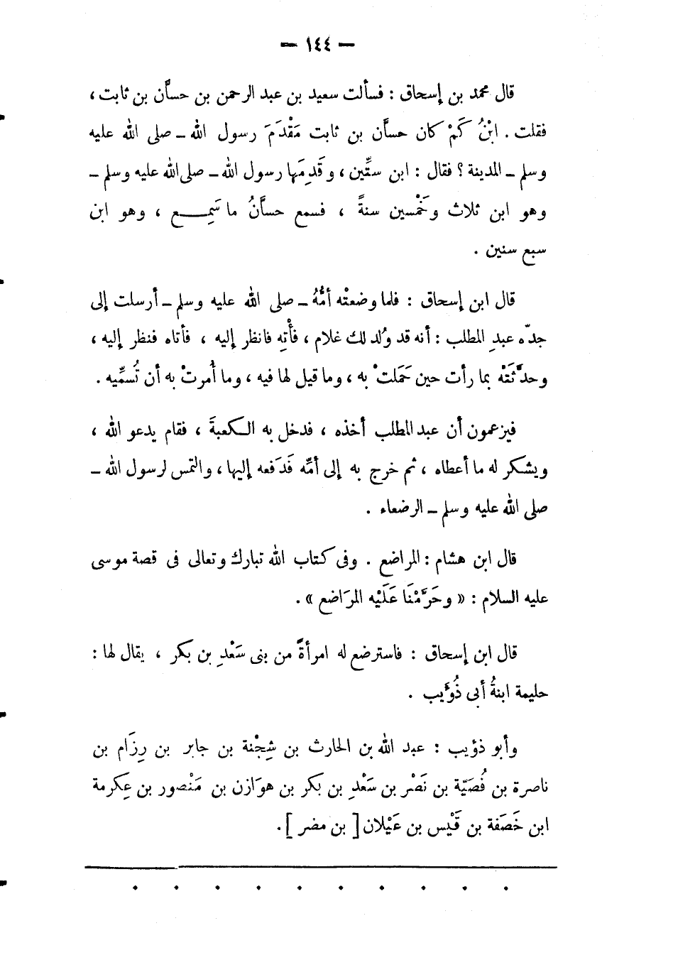 قَالَ مُحَمّدُ بْنُ إسْحَاقَ: فَسَأَلْت سَعِيدَ بْنَ عَبْدِ الرّحْمَنِ بْنِ حَسّانَ بْنِ ثَابِتٍ، فَقُلْت. ابْنُ كَمْ كَانَ حَسّانُ بْنُ ثَابِتٍ مَقْدَمَ رسول الله- صلى الله عليه وسلم- المدينة؟ فقال: ابن ستّين، وَقَدِمَهَا رَسُولُ اللهِ- صَلّى اللهُ عَلَيْهِ وَسَلّمَ- وَهُوَ ابْنُ ثَلَاثٍ وَخَمْسِينَ سَنَةً، فَسَمِعَ حَسّانُ ما سمع، وهو ابن سبع سنين.