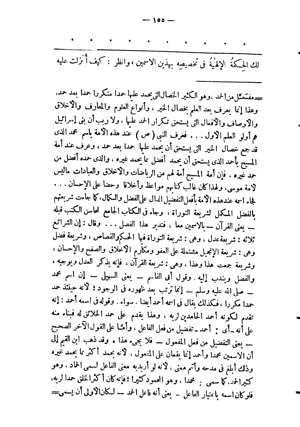 - مفعّل من الحمد، وهو الكثير الخصال التى يحمد عليها حمدا متكررا حمدا بعد حمد. وهذا إنما يعرف بعد العلم بخصال الخير، وأنواع العلوم والمعارف والأخلاق والأوصاف والأفعال التى يستحق تكرار الحمد عليها، ولا ريب أن بنى إسرائيل هم أولو العلم الأول ... فعرف النبى (ص) عند هذه الأمة باسم محمد الذى قد جمع خصال الخير التى يستحق أن يحمد عليها حمدا بعد حمد، وعرف عند أمة المسيح بأحمد الذى يستحق أن يحمد أفضل مما يحمد غيره، والذى حمده أفضل من حمد غيره، فإن أمة المسيح أمة لهم من الرياضات والأخلاق والعبادات ما ليس لأمة موسى، ولهذا كان غالب كتابهم مواعظ وأخلاقا وحضا على الإحسان ... فجاء اسمه عند هذه الأمة بأفعل التفضيل الدال على الفضل والكمال، كما جاءت شريعتهم بالفضل المكمل لشريعة التوراة، وجاء فى الكتاب الجامع لمحاسن الكتب قبله- يعنى القرآن- بالاسمين معا، فتدبر هذا الفصل ... وقال: إن الشرائع ثلاثة: شريعة عدل، وهى: شريعة التوراة فيها الحكم والقصاص، وشريعة فضل وهى: شريعة الإنجيل مشتملة على العفو ومكارم الأخلاق والصفح والإحسان، وشريعة جمعت هذا وهذا، وهى: شريعة القرآن، فإنه يذكر العدل ويوجبه، والفضل ويندب إليه وقول أبى القاسم- يعنى السهيلى- إن اسم محمد- صلى الله عليه وسلم- إنما ترتب بعد ظهوره فى الوجود؛ لأنه حينئذ حمد حمدا مكررا، فكذلك يقال فى اسمه أحمد أيضا. سواء. وقوله فى اسمه أحمد: إنه تقدم لكونه أحمد الحامدين لربه، وهذا يقدم على حمد الخلائق له فبناء منه على أنه- أى: أحمد- تفضيل من فعل الفاعل، وأمّا على القول الاخر الصحيح- يعنى التفضيل من فعل المفعول- فلا يجىء هذا» وقد ذهب ابن القيم إلى أن الاسمين محمدا وأحمد إنما يقعان على المفعول، لأنه يحمد أكثر مما يحمد غيره وذلك أبلغ فى مدحه وأتم معنى، لأنه لو أريد به معنى الفاعل لسمى الحماد، وهو كثير الحمد، كما سمى: محمدا، وهو المحمود كثيرا؛ فإنه كان أكثر الخلق حمدا لربه، فلو كان اسمه باعتبار الفاعل- يعنى أنه فاعل الحمد- لكان الأولى أن يسمى-