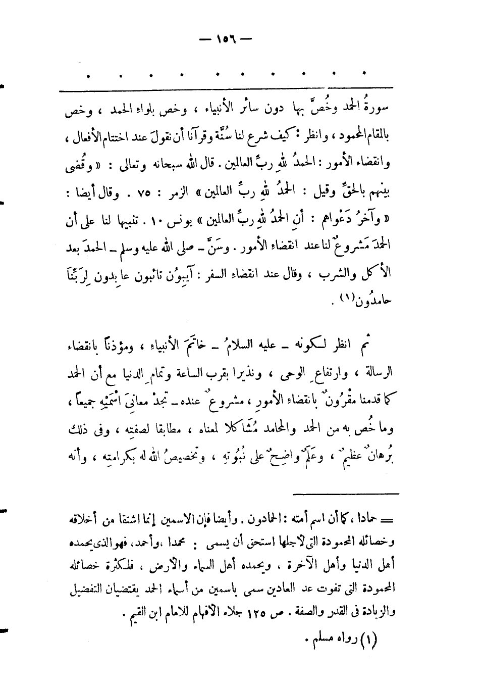 سُورَةُ الْحَمْدِ وَخُصّ بِهَا دُونَ سَائِرِ الْأَنْبِيَاءِ، وَخُصّ بِلِوَاءِ الْحَمْدِ، وَخُصّ بِالْمَقَامِ الْمَحْمُودِ، وَانْظُرْ: كَيْفَ شَرّعَ لَنَا سُنّةً وَقُرْآنًا أَنْ نَقُولَ عِنْدَ اخْتِتَامِ الْأَفْعَالِ، وَانْقِضَاءِ الْأُمُورِ: الْحَمْدُ لِلّهِ رَبّ الْعَالَمِينَ. قَالَ اللهُ سُبْحَانَهُ وَتَعَالَى: «وَقُضِيَ بَيْنَهُمْ بِالْحَقّ وَقِيلَ: الْحَمْدُ لِلّهِ رَبّ الْعَالَمِينَ» الزّمَرَ: 75. وَقَالَ أَيْضًا: