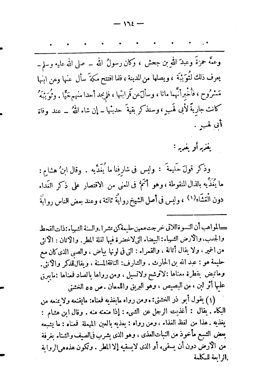 - المواهب أن النسوة اللاتى خرجت معهن حليمة كن عشرا. والسنة الشهباء: ذات القحط والجدب، والأرض الشهباء: البيضاء التى لا خضرة فيها لقلة المطر. والأتان: الأنثى من الحمير، ولا يقال أتانة، والقمراء: التى فى لونها بياض، والصبى الذى كان مع حليمة هو: عبد الله بن الحارث. والشارف: الناقة المسنة، ويقال للذكر والأنثى. وما تبض بقطرة معناها: لا ترشح ولا تسيل، ومن رواها بالصاد فمعناها: ما يبرق عليها أثر لبن، من البصيص، وهو البريق واللمعان. ص 55 الخشنى