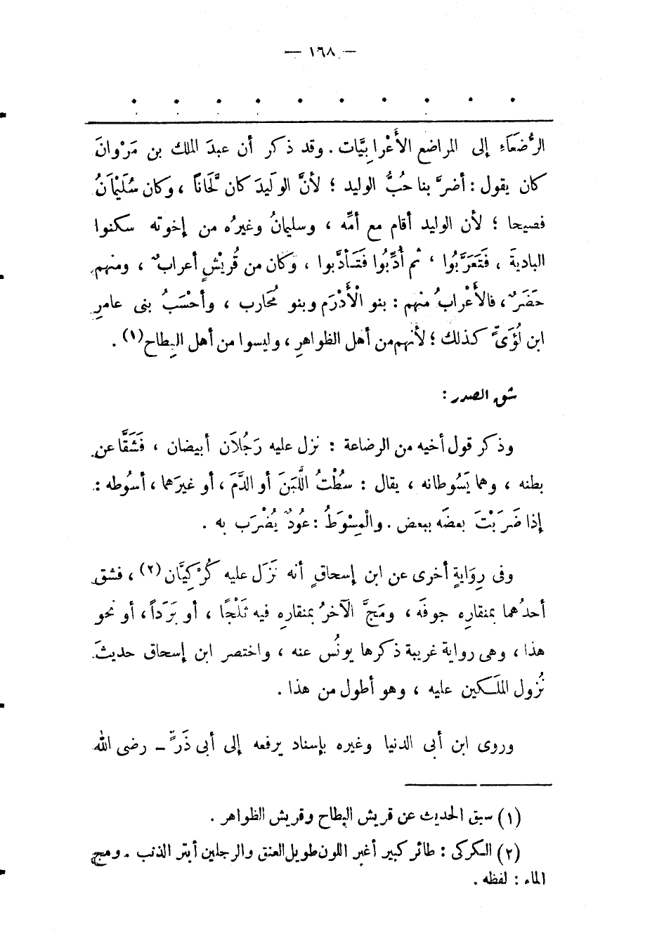 الرّضَعَاءِ إلَى الْمَرَاضِعِ الْأَعْرَابِيّاتِ. وَقَدْ ذُكِرَ أَنّ عَبْدَ الْمَلِكِ بْنَ مَرْوَانَ كَانَ يَقُولُ: أَضَرّ بِنَا حُبّ الْوَلِيدِ؛ لِأَنّ الْوَلِيدَ كَانَ لَحّانًا، وَكَانَ سُلَيْمَانُ فَصِيحًا؛ لِأَنّ الْوَلِيدَ أَقَامَ مَعَ أُمّهِ، وَسُلَيْمَانُ وَغَيْرُهُ مِنْ إخْوَتِهِ سَكَنُوا الْبَادِيَةَ، فَتَعَرّبُوا، ثُمّ أُدّبُوا فَتَأَدّبُوا، وَكَانَ مِنْ قُرَيْشٍ أَعْرَابٌ، وَمِنْهُمْ حَضَرٌ، فَالْأَعْرَابُ مِنْهُمْ: بَنُو الْأَدْرَمِ وبنو محارب، وأحسب بنى عامر ابن لُؤَيّ كَذَلِكَ؛ لِأَنّهُمْ مِنْ أَهْلِ الظّوَاهِرِ، وَلَيْسُوا مِنْ أَهْلِ الْبِطَاحِ «1» .