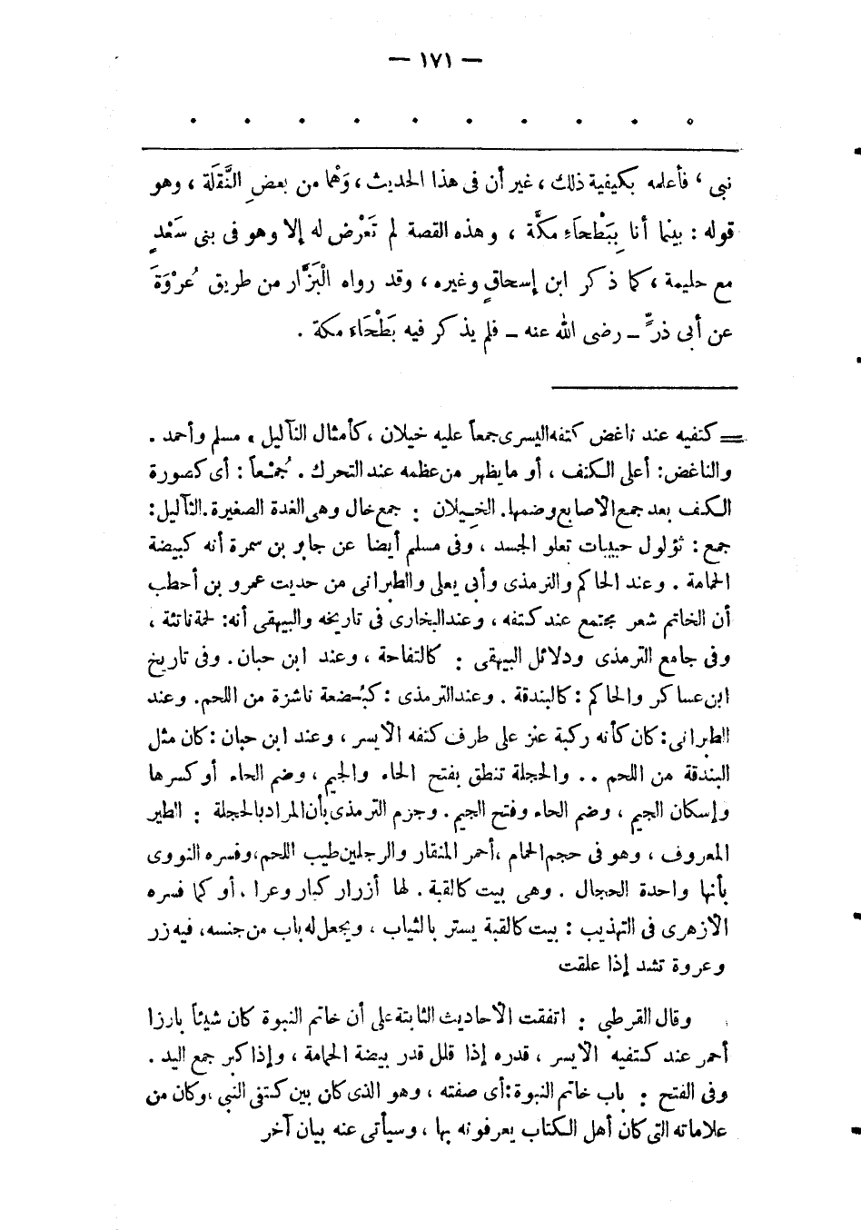 - كتفيه عند ناغض كتفه اليسرى جمعا عليه خيلان، كأمثال الثاليل» مسلم وأحمد. والناغض: أعلى الكتف، أو ما يظهر من عظمه عند التحرك. جمعا: أى كصورة الكف بعد جمع الأصابع وضمها. الخيلان: جمع خال وهى الغدة الصغيرة. الثاليل: جمع: ثؤلول حبيبات تعلو الجسد، وفى مسلم أيضا عن جابر بن سمرة أنه كبيضة الحمامة. وعند الحاكم والترمذى وأبى يعلى والطبرانى من حديث عمرو بن أحطب أن الخاتم شعر مجتمع عند كتفه، وعند البخارى فى تاريخه والبيهقى أنه: لحمة ناتئة، وفى جامع الترمذى ودلائل البيهقى: كالتفاحة، وعند ابن حبان. وفى تاريخ ابن عساكر والحاكم: كالبندقة. وعند الترمذى: كبضعة ناشزة من اللحم. وعند الطبرانى: كان كأنه ركبة عنز على طرف كتفه الأيسر، وعند ابن حبان: كان مثل البندقة من اللحم.. والحجلة تنطق بفتح الحاء والجيم، وضم الحاء أو كسرها وإسكان الجيم، وضم الحاء وفتح الجيم. وجزم الترمذى بأن المراد بالحجلة: الطير المعروف، وهو فى حجم الحمام، أحمر المنقار والرجلين طيب اللحم، وفسره النووى بأنها واحدة الحجال. وهى بيت كالقبة. لها أزرار كبار وعرا، أو كما فسره الأزهرى فى التهذيب: بيت كالقبة يستر بالثياب، ويجعل له باب من جنسه، فيه زر وعروة تشد إذا علقت وقال القرطبى: اتفقت الأحاديث الثابتة على أن خاتم النبوة كان شيئا بارزا أحمر عند كتفيه الأيسر، قدره إذا قلل قدر بيضة الحمامة، وإذا كبر جمع اليد. وفى الفتح: باب خاتم النبوة: أى صفته، وهو الذى كان بين كتفى النبى، وكان من علاماته التى كان أهل الكتاب يعرفونه بها، وسيأتى عنه بيان آخر