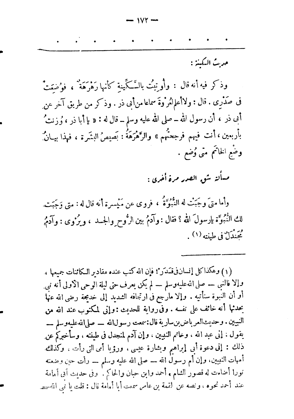 وَذُكِرَ فِيهِ أَنّهُ قَالَ: وَأُوتِيت بِالسّكِينَةِ كَأَنّهَا رَهْرَهَةٌ، فَوُضِعَتْ فِي صَدْرِي. قَالَ: وَلَا أَعْلَمُ لِعُرْوَةِ سَمَاعًا مِنْ أَبِي ذَرّ. وَذَكَرَ مِنْ طَرِيقٍ آخَرَ عَنْ أَبِي ذَرّ، أن رسول الله- صلى الله عليه وسلم- قَالَ لَهُ: «يَا أَبَا ذَرّ، وُزِنْت بِأَرْبَعِينَ، أَنْتَ فِيهِمْ فَرَجَحْتهمْ» وَالرّهْرَهَةُ: بَصِيصُ الْبَشَرَةِ، فَهَذَا بَيَانُ وَضْعِ الْخَاتَمِ مَتَى وُضِعَ.