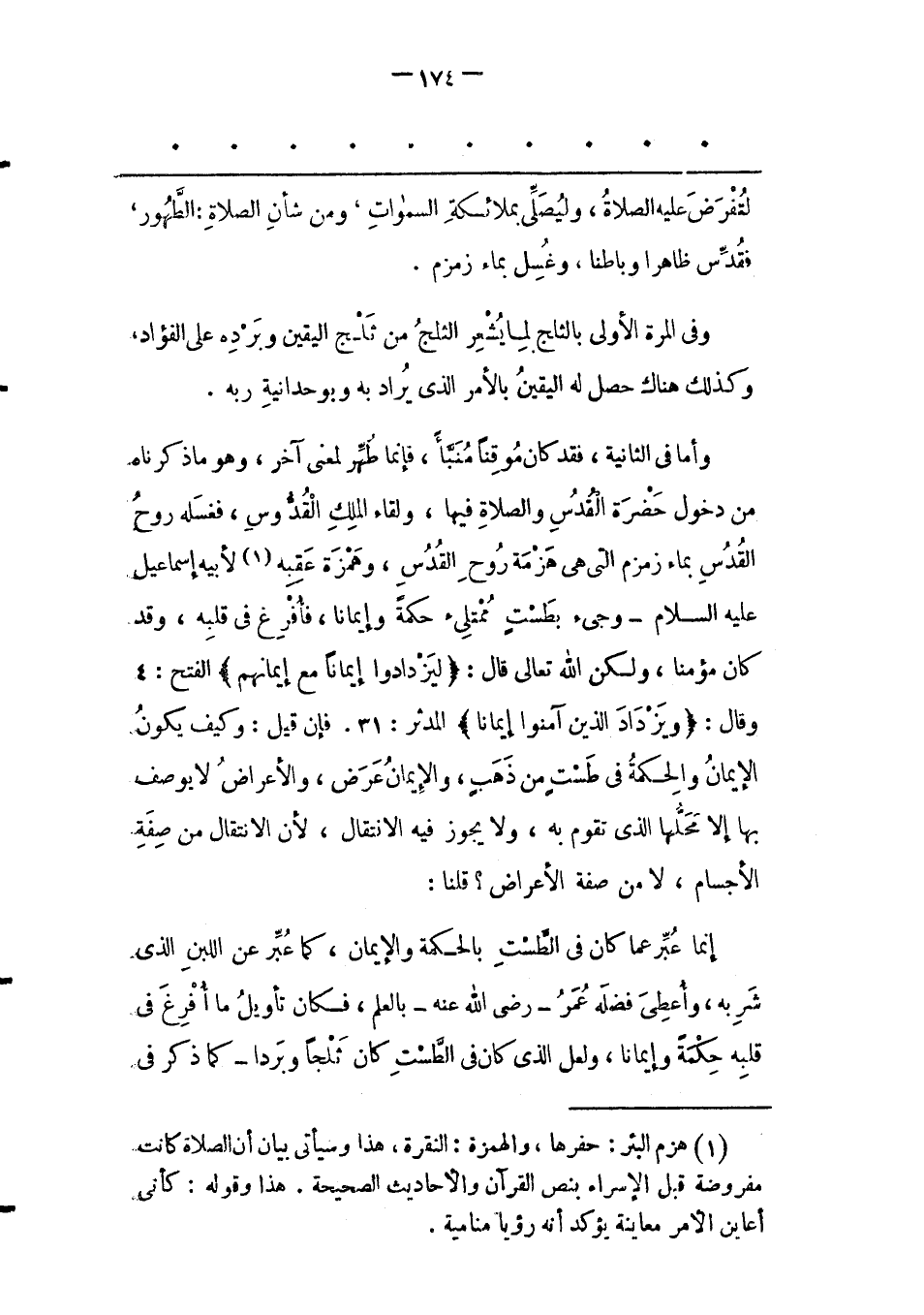 (1) هزم البئر: حفرها، والهمزة: النقرة، هذا وسيأتى بيان أن الصلاة كانت مفروضة قبل الإسراء بنص القرآن والأحاديث الصحيحة. هذا وقوله: كأنى أعاين الأمر معاينة يؤكد أنه رؤيا منامية.