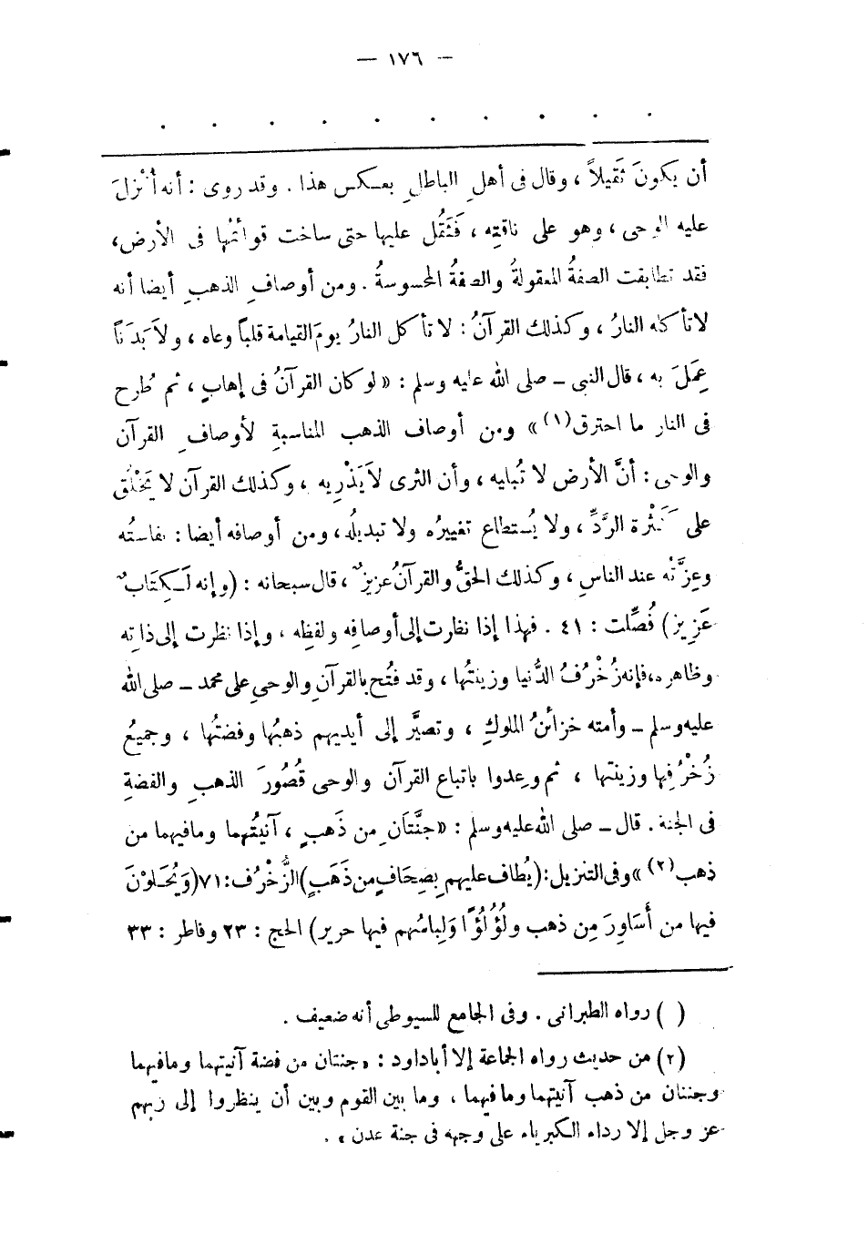 أَنْ يَكُون ثَقِيلًا، وَقَالَ فِي أَهْلِ الْبَاطِلِ بِعَكْسِ هَذَا. وَقَدْ رُوِيَ: أَنّهُ أُنْزِلَ عَلَيْهِ الْوَحْيُ، وَهُوَ عَلَى نَاقَتِهِ، فَثَقُلَ عَلَيْهَا حَتّى سَاخَتْ قَوَائِمُهَا فِي الْأَرْضِ، فَقَدْ تَطَابَقَتْ الصّفَةُ الْمَعْقُولَةُ وَالصّفَة الْمَحْسُوسَةُ. وَمِنْ أَوْصَافِ الذّهَبِ أَيْضًا أَنّهُ لَا تَأْكُلُهُ النّارُ، وَكَذَلِكَ الْقُرْآنُ: لَا تَأْكُلُ النّارُ يَوْمَ الْقِيَامَةِ قَلْبًا وَعَاهُ، وَلَا بَدَنًا عَمِلَ بِهِ، قَالَ النّبِيّ- صَلَّى اللَّهُ عَلَيْهِ وَسَلَّمَ: «لَوْ كَانَ الْقُرْآنُ فِي إهَابٍ، ثم رح فِي النّارِ مَا احْتَرَقَ «1» » وَمِنْ أَوْصَافِ الذّهَبِ الْمُنَاسِبَةِ لِأَوْصَافِ الْقُرْآنِ وَالْوَحْيِ: أَنّ الْأَرْضَ لَا تُبْلِيهِ، وَأَنّ الثّرَى لَا يَذْرِيهِ، وَكَذَلِكَ الْقُرْآنُ لَا يَخْلُقُ عَلَى كَثْرَةِ الرّدّ، وَلَا يُسْتَطَاعُ تَغْيِيرُهُ وَلَا تَبْدِيلُهُ، وَمِنْ أَوْصَافِهِ أَيْضًا: نَفَاسَتُهُ وَعِزّتُهُ عِنْدَ النّاسِ، وَكَذَلِكَ الْحَقّ وَالْقُرْآنُ عَزِيزٌ، قَالَ سُبْحَانَهُ: (وَإِنّهُ لَكِتَابٌ عَزِيزٌ) فُصّلَتْ: 41. فَهَذَا إذَا نَظَرْت إلَى أَوْصَافِهِ وَلَفْظِهِ، وَإِذَا نَظَرْت إلَى ذَاتِهِ وَظَاهِرِهِ، فَإِنّهُ زُخْرُفُ الدّنْيَا وَزِينَتُهَا، وَقَدْ فُتِحَ بِالْقُرْآنِ وَالْوَحْيِ عَلَى مُحَمّدٍ- صَلَّى اللَّهُ عَلَيْهِ وَسَلَّمَ- وَأُمّتِهِ خَزَائِنُ الْمُلُوكِ، وَتَصِيرُ إلى أيديهم ذهبها وفضنها، وَجَمِيعُ زُخْرُفِهَا وَزِينَتِهَا، ثُمّ وُعِدُوا بِاتّبَاعِ الْقُرْآنِ وَالْوَحْيِ قُصُورَ الذّهَبِ وَالْفِضّةِ فِي الْجَنّةِ. قَالَ- صَلَّى اللَّهُ عَلَيْهِ وَسَلَّمَ: «جَنّتَانِ مِنْ ذَهَبٍ، آنِيَتُهُمَا وَمَا فِيهِمَا مِنْ ذَهَبٍ «2» » وَفِي التّنْزِيلِ: (يُطافُ عَلَيْهِمْ بِصِحافٍ مِنْ ذَهَبٍ) الزّخْرُفَ: 71 (يُحَلَّوْنَ فِيها مِنْ أَساوِرَ مِنْ ذَهَبٍ وَلُؤْلُؤاً وَلِباسُهُمْ فِيها حَرِيرٌ) الحج: 23 وفاطر: 33
