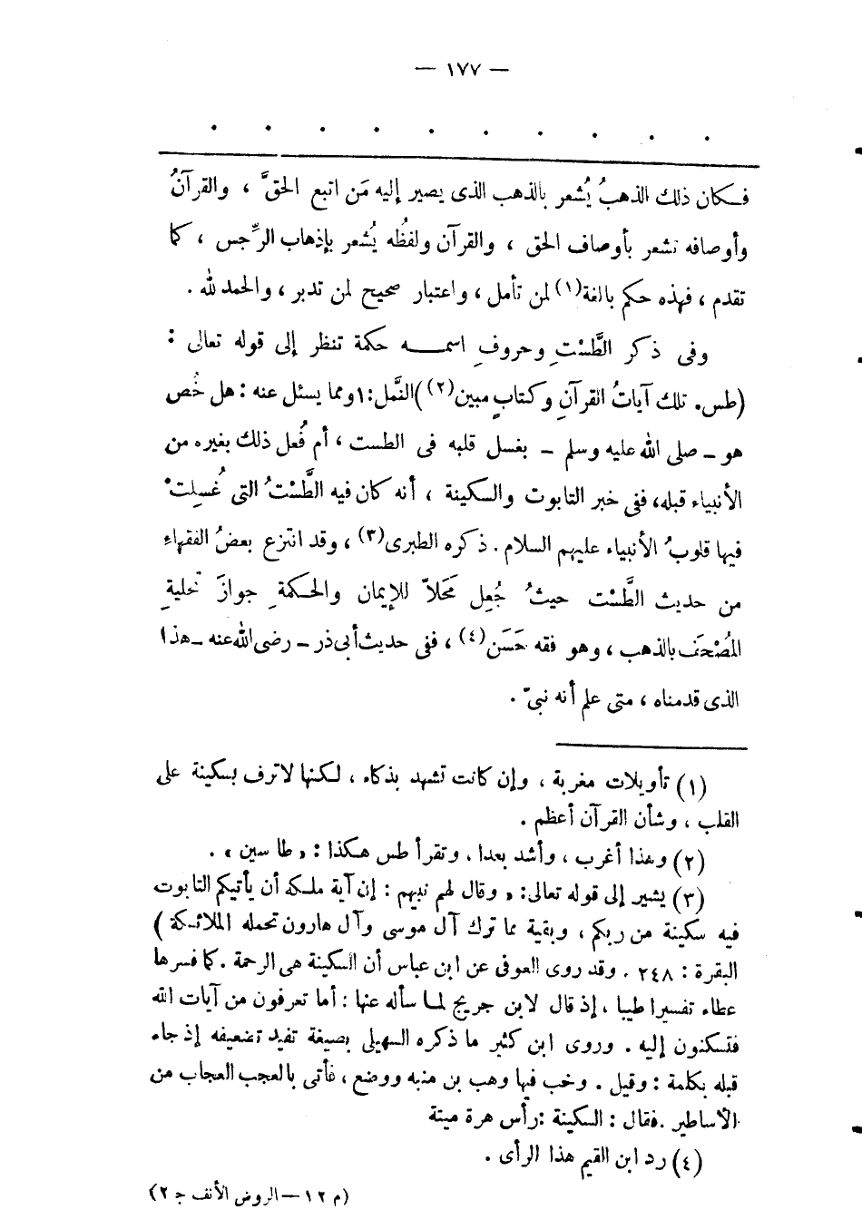 (3) يشير إلى قوله تعالى: «وقال لهم نبيهم: إن آية ملكه أن يأتيكم التابوت فيه سكينة من ربكم، وبقية مما ترك آل موسى وآل هارون تحمله الملائكة) البقرة: 248. وقد روى العوفى عن ابن عباس أن السكينة هى الرحمة. كما فسرها عطاء تفسيرا طيبا، إذ قال لابن جريج لما سأله عنها: أما تعرفون من آيات الله فتسكنون إليه. وروى ابن كثير ما ذكره السهيلى بصيغة تفيد تضعيفه إذ جاء قبله بكلمة: وقيل. وخب فيها وهب بن منبه ووضع، فأتى بالعجب العجاب من الأساطير. فقال: السكينة: رأس هرة ميتة