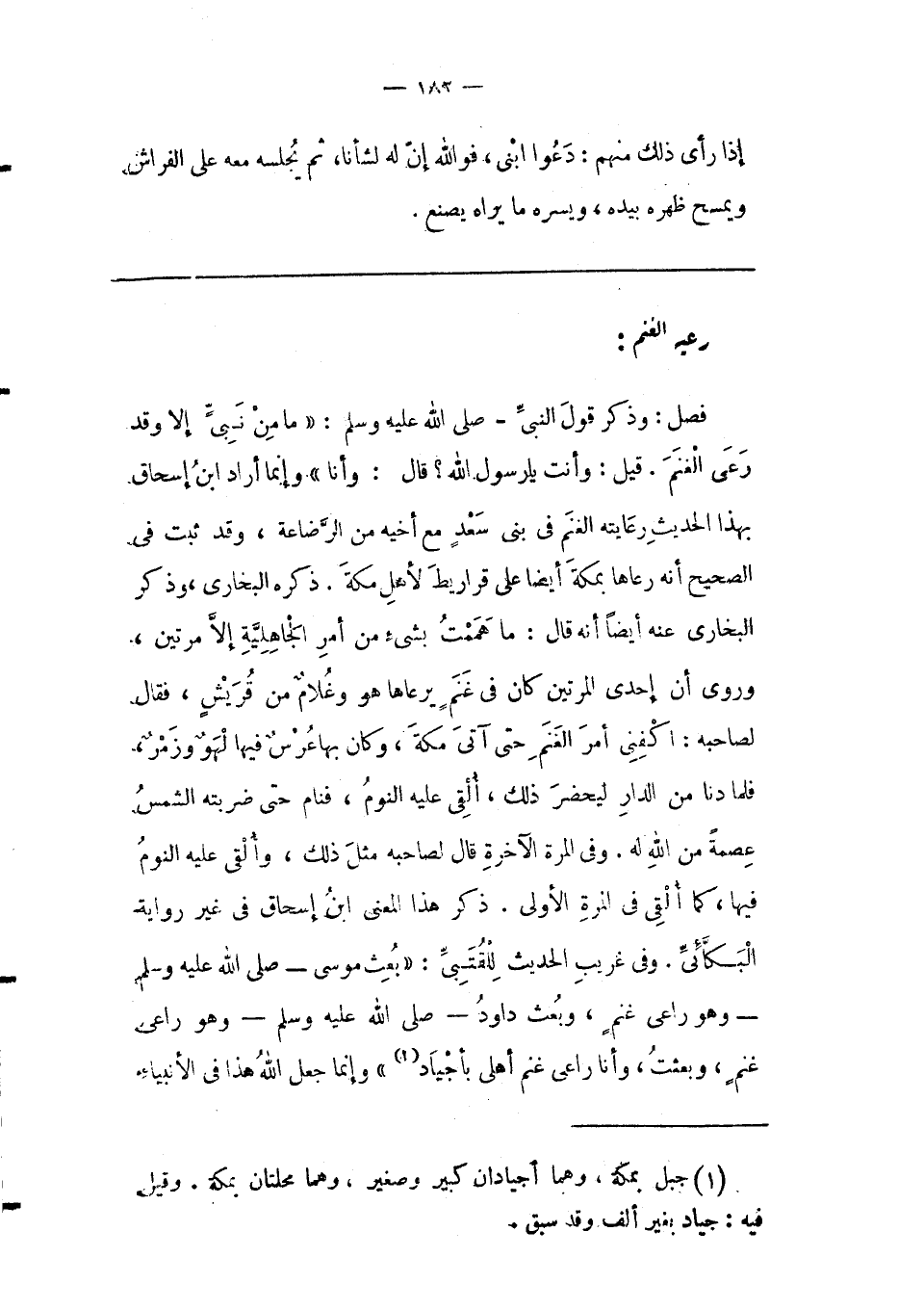 فَصْلٌ: وَذَكَرَ قَوْلَ النّبِيّ- صَلَّى اللَّهُ عَلَيْهِ وَسَلَّمَ: «مَا مِنْ نَبِيّ إلّا وَقَدْ رَعَى الْغَنَمَ.. قِيلَ: وَأَنْتَ يَا رَسُولَ اللهِ؟ قَالَ: وَأَنَا» وَإِنّمَا أَرَادَ ابْنُ إسْحَاقَ بِهَذَا الْحَدِيثِ رِعَايَتَهُ الْغَنَمَ فِي بَنِي سَعْدٍ مَعَ أَخِيهِ مِنْ الرّضَاعَةِ، وَقَدْ ثَبَتَ فِي الصّحِيحِ أَنّهُ رَعَاهَا بِمَكّةَ أَيْضًا عَلَى قَرَارِيطَ لِأَهْلِ مَكّةَ. ذَكَرَهُ الْبُخَارِيّ، وَذَكَرَ الْبُخَارِيّ عَنْهُ أَيْضًا أَنّهُ قَالَ: مَا هَمَمْت بِشَيْءِ مِنْ أَمْرِ الْجَاهِلِيّةِ إلّا مَرّتَيْنِ، وَرَوَى أَنّ إحْدَى الْمَرّتَيْنِ كَانَ فِي غَنَمٍ يَرْعَاهَا هُوَ وَغُلَامٌ مِنْ قُرَيْشٍ، فَقَالَ لِصَاحِبِهِ: اكْفِنِي أَمْرَ الْغَنَمِ حَتّى آتِيَ مَكّةَ، وَكَانَ بِهَا عُرْسٌ فِيهَا لَهْوٌ وَزَمْرٌ، فَلَمّا دَنَا مِنْ الدّارِ لِيَحْضُرَ ذَلِكَ، أُلْقِيَ عَلَيْهِ النّوْمُ، فَنَامَ حَتّى ضَرَبَتْهُ الشّمْسُ عِصْمَةً مِنْ اللهِ لَهُ. وَفِي الْمَرّةِ الْآخِرَةِ قَالَ لِصَاحِبِهِ مِثْلَ ذَلِكَ، وَأُلْقِيَ عَلَيْهِ النّوْمُ فِيهَا، كَمَا أُلْقِيَ فِي الْمَرّةِ الْأُولَى. ذَكَرَ هَذَا الْمَعْنَى ابْنُ إسْحَاقَ فِي غَيْرِ رواية البكّائىّ. وفى غريب الحديث للقتبنىّ: «بُعِثَ مُوسَى- صَلَّى اللَّهُ عَلَيْهِ وَسَلَّمَ- وَهُوَ رَاعِي غَنَمٍ، وَبُعِثَ دَاوُدُ- صَلَّى اللَّهُ عَلَيْهِ وَسَلَّمَ- وَهُوَ رَاعِي غَنَمٍ، وَبُعِثْت، وَأَنَا رَاعِي غَنَمِ أَهْلِي بِأَجْيَادِ»