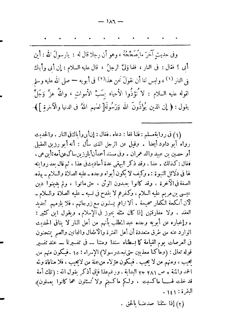 (1) فى رواية مسلم: فلما قفا: دعاه، فقال: إن أبى وأباك فى النار. والحديث رواه أبو داود أيضا. وقيل عن الرجل الذى سأل: أنه أبو رزين العقيلى أو حصين بن عبيد والد عمران. وفى مسند أحمد أن أبا رزين سأل عن أمه: أين هى، فقال: كذلك. هذا، وقد ذكر البيهقى عدة أحاديث فى هذا، ثم قال بعد روايته لها فى دلائل النبوة: «وكيف لا يكون أبواه وجده- عليه الصلاة والسلام- بهذه الصفة فى الاخرة، وقد كانوا يعبدون الوثن، حتى ماتوا، ولم يدينوا دين عيسى بن مريم عليه السلام، وكفرهم لا يقدح فى نسبه- عليه الصلاة والسلام- لأن أنكحة الكفار صجيحة. ألا تراهم يسلون مع زوجاتهم، فلا يلزمهم تجديد العقد، ولا مفارقتهن إذا كان مثله يجوز فى الإسلام» ويقول ابن كثير: «وإخباره عن أبويه وجده عبد المطلب بأنهم من أهل النار لا ينافى الحديث الوارد عنه من طرق متعددة أن أهل الفترة والأطفال والمجانين والصم يمتحنون فى العرصات يوم القيامة كما بسطناه سندا ومتنا- فى تفسيرنا- عند تفسير قوله تعالى: (وَما كُنَّا مُعَذِّبِينَ حَتَّى نَبْعَثَ رَسُولًا) الإسراء: 15. فيكون منهم من يجيب، ومنهم من لا يجيب. فيكون هؤلاء من جملة من لا يجيب، فلا منافاة ولله الحمد والمنة» ص 281 ج 2 البداية، ورغم هذا فإنى أذكر بقول الله: (تلك أمة قد خلت لها ما كسبت، ولكم ما كسبتم ولا تسئلون عما كانوا يعملون) البقرة: 141.