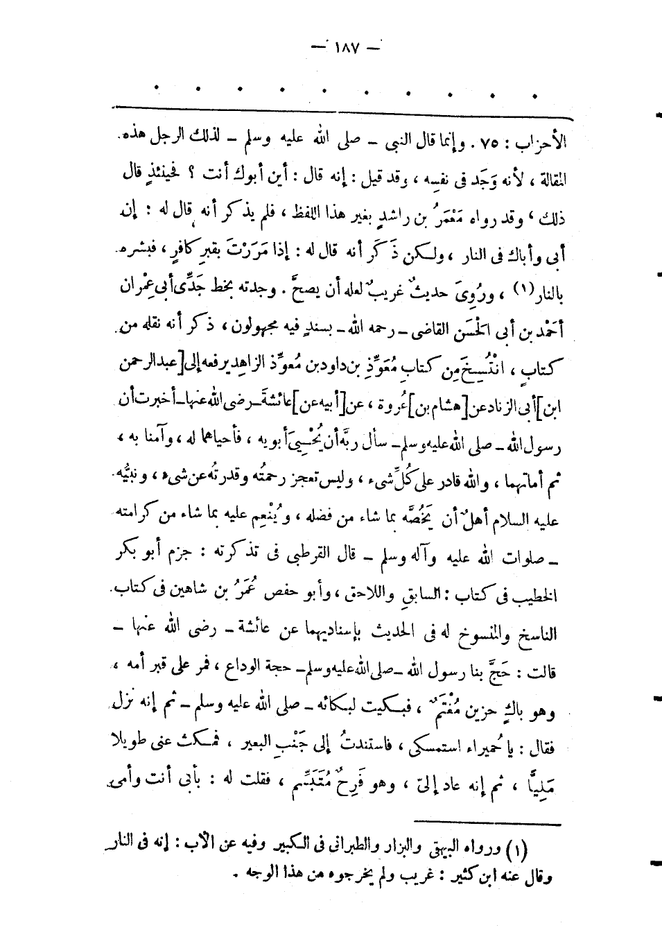 الْأَحْزَابَ: 75. وَإِنّمَا قَالَ النّبِيّ- صَلَّى اللَّهُ عَلَيْهِ وَسَلَّمَ- لِذَلِكَ الرّجُلِ هَذِهِ الْمَقَالَةَ، لِأَنّهُ وَجَدَ فِي نَفْسِهِ، وَقَدْ قِيلَ: إنّهُ قَالَ: أَيْنَ أَبُوك أَنْتَ؟ فَحِينَئِذٍ قَالَ ذَلِكَ، وَقَدْ رَوَاهُ مَعْمَرُ بْنُ رَاشِدٍ بِغَيْرِ هَذَا اللّفْظِ، فَلَمْ يَذْكُرْ أَنّهُ قَالَ لَهُ: إنّ أَبِي وَأَبَاك فِي النّارِ، وَلَكِنْ ذَكَرَ أَنّهُ قَالَ لَهُ: إذَا مَرَرْت بِقَبْرِ كَافِرٍ، فَبَشّرْهُ بِالنّارِ «1» ، وَرُوِيَ حَدِيثٌ غَرِيبٌ لَعَلّهُ أَنْ يَصِحّ. وَجَدْته بِخَطّ جَدّي أَبِي عِمْرَانَ أَحْمَدَ بْنِ أَبِي الْحَسَنِ الْقَاضِي- رَحِمَهُ اللهُ- بِسَنَدِ فِيهِ مَجْهُولُونَ، ذَكَرَ أَنّهُ نَقَلَهُ مِنْ كِتَابٍ، اُنْتُسِخَ مِنْ كِتَابِ مُعَوّذِ بْنِ دَاوُدَ بْنِ مُعَوّذِ الزّاهِدِ يَرْفَعُهُ إلى [عبد الرحمن ابْنُ] أَبِي الزّنَادِ عَنْ [هِشَامِ بْنِ] عُرْوَةَ، عَنْ [أَبِيهِ عَنْ] عَائِشَةَ- رَضِيَ اللهُ عَنْهَا- أَخْبَرَتْ أَنّ رَسُولَ اللهِ- صَلَّى اللَّهُ عَلَيْهِ وَسَلَّمَ- سَأَلَ رَبّهُ أَنْ يُحْيِيَ أَبَوَيْهِ، فَأَحْيَاهُمَا لَهُ، وَآمَنَا بِهِ، ثُمّ أَمَاتَهُمَا، وَاَللهُ قَادِرٌ عَلَى كُلّ شَيْءٍ، وَلَيْسَ تَعْجَزُ رَحْمَتُهُ وَقُدْرَتُهُ عَنْ شَيْءٍ، وَنَبِيّهُ عَلَيْهِ السّلَامُ أَهْلٌ أَنْ يَخُصّهُ بِمَا شَاءَ مِنْ فَضْلِهِ، وَيُنْعِمَ عَلَيْهِ بِمَا شَاءَ مِنْ كَرَامَتِهِ- صَلَوَاتُ اللهِ عَلَيْهِ وَآلِهِ وَسَلّمَ- قَالَ الْقُرْطُبِيّ فِي تَذْكِرَتِهِ: جَزَمَ أَبُو بَكْرٍ الْخَطِيبُ فِي كِتَابِ: السّابِقِ وَاللّاحِقِ، وَأَبُو حَفْصٍ عُمَرُ بْنُ شَاهِينَ فِي كِتَابِ النّاسِخِ وَالْمَنْسُوخِ لَهُ فِي الْحَدِيثِ بِإِسْنَادَيْهِمَا عَنْ عَائِشَةَ- رَضِيَ اللهُ عَنْهَا- قَالَتْ: حَجّ بِنَا رَسُولُ اللهِ- صَلّى اللهُ عَلَيْهِ وَسَلّمَ- حجة الوداع، فمز عَلَى قَبْرِ أُمّهِ، وَهُوَ بَاكٍ حَزِينٌ مُغْتَمّ، فَبَكَيْت لِبُكَائِهِ- صَلَّى اللَّهُ عَلَيْهِ وَسَلَّمَ- ثُمّ إنّهُ نَزَلَ فَقَالَ: يَا حُمَيْرَاءُ اسْتَمْسِكِي، فَاسْتَنَدْت إلَى جَنْبِ الْبَعِيرِ، فَمَكَثَ عَنّي طَوِيلًا مَلِيّا، ثُمّ إنّهُ عَادَ إلَيّ، وَهُوَ فَرِحٌ مُتَبَسّمٌ، فقلت له: بأبى أنت وأمى