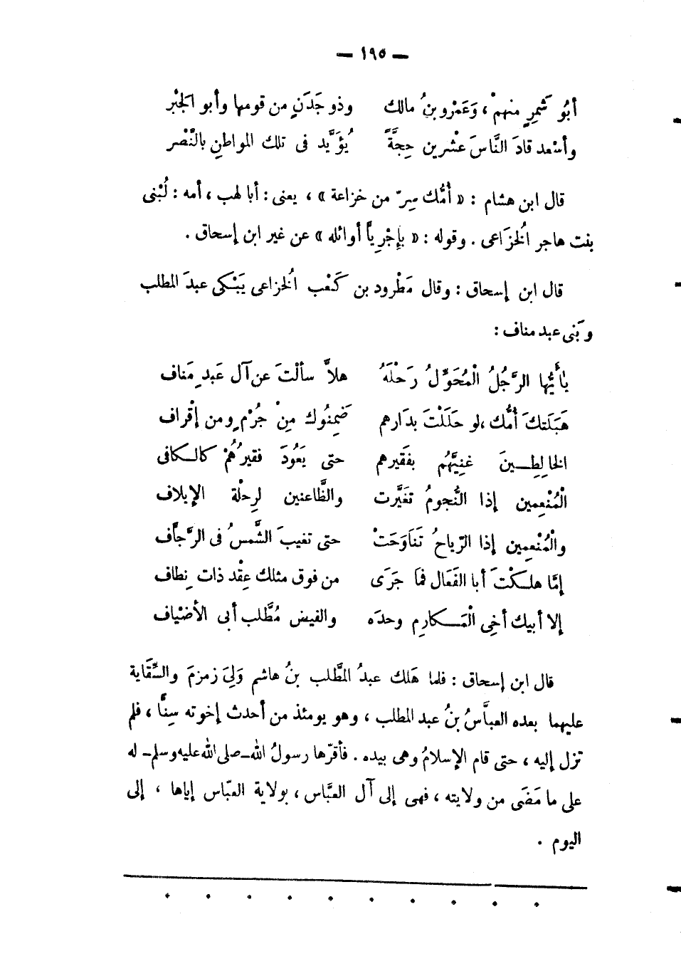 قَالَ ابْنُ إسْحَاقَ: وَقَالَ مَطْرُودُ بْنُ كَعْبٍ الْخُزاَعِيّ يَبْكِي عَبْدَ الْمُطّلِبِ وبَني عَبْدِ مَنَافٍ: