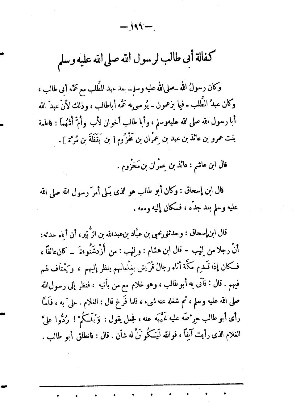 قَالَ ابْنُ إسْحَاقَ: وَكَانَ أَبُو طَالِبٍ هُوَ الّذِي يَلِي أَمْرَ رَسُولِ اللهِ صَلّى اللهُ عَلَيْهِ وَسَلّمَ بَعْدَ جَدّهِ، فَكَانَ إلَيْهِ وَمَعَهُ.