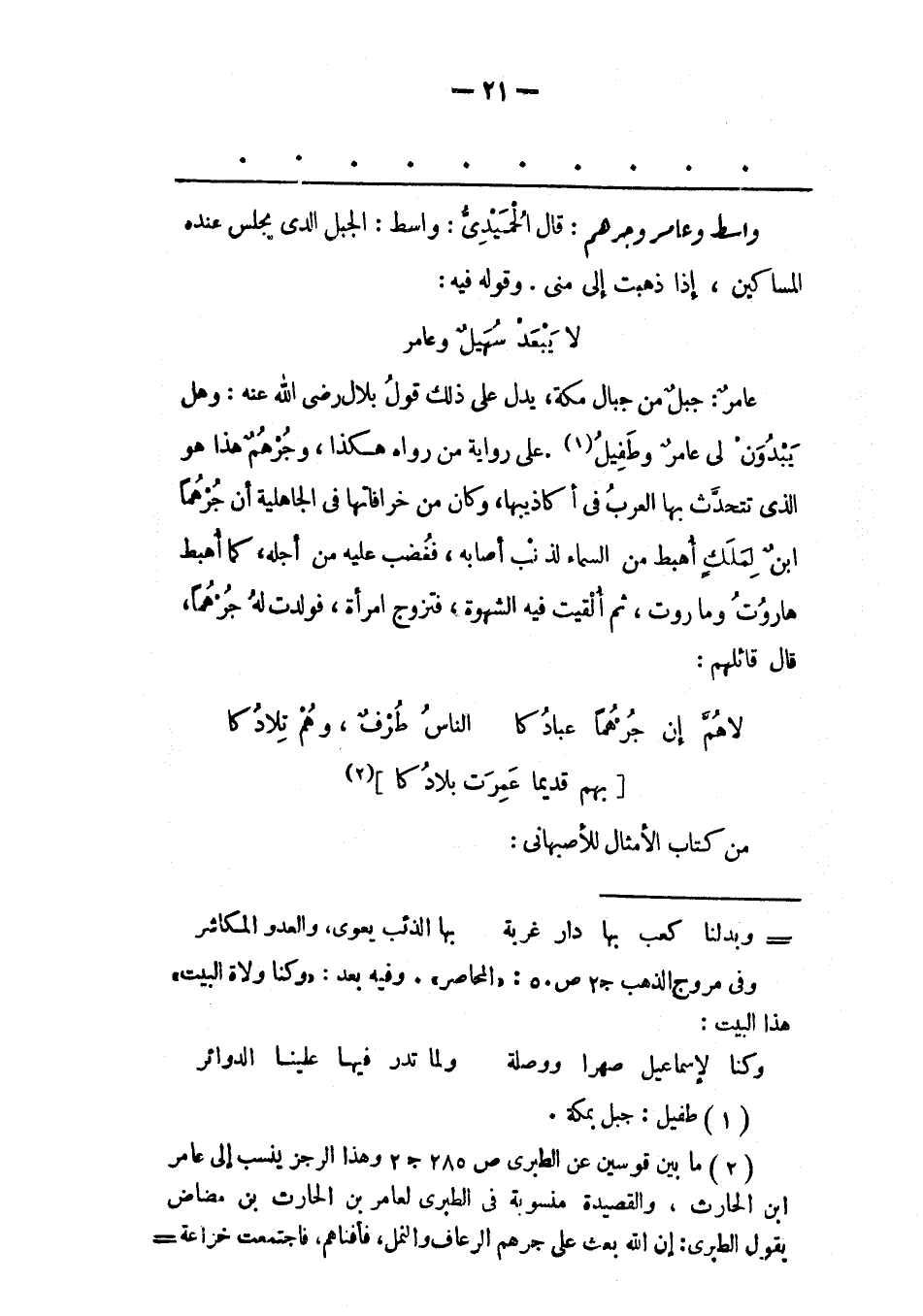 (2) ما بين قوسين عن الطبرى ص 285 ج 2 وهذا الرجز ينسب إلى عامر ابن الحارث، والقصيدة منسوبة فى الطبرى لعامر بن الحارث بن مضاض يقول الطبرى: إن الله بعث على جرهم الرعاف والنمل، فأفناهم، فاجتمعت خزاعة-