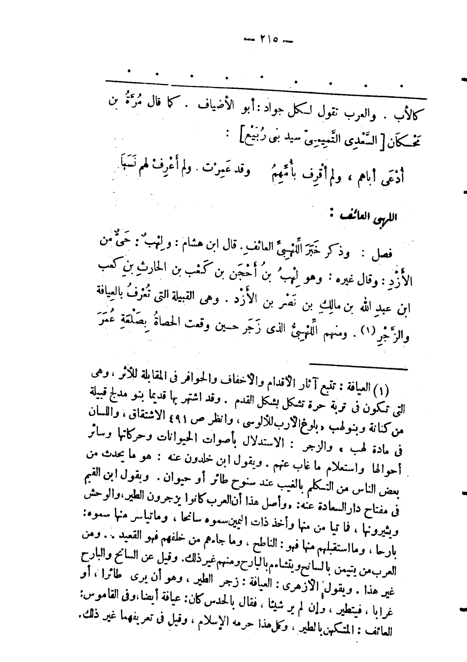 (1) العيافة: تتبع آثار الأقدام والأخفاف والحوافر فى المقابلة للأثر، وهى التى تكون فى تربة حرة تشكل بشكل القدم. وقد اشتهر بها قديما بنو مدلج قبيلة من كنانة وبنو لهب «بلوغ الأرب للألوسى، وانظر ص 491 الاشتقاق، واللسان فى مادة لهب» والزجر: الاستدلال بأصوات الحيوانات وحركاتها وسائر أحوالها واستعلام ما غاب عنهم. ويقول ابن خلدون عنه: هو ما يحدث من بعض الناس من التكلم بالغيب عند سنوح طائر أو حيوان. ويقول ابن القيم فى مفتاح دار السعادة عنه: «وأصل هذا أن العرب كانوا يزجرون الطير، والوحش ويثيرونها، فما تيا من منها وأخذ ذات اليمين سموه سانحا، وما تياسر منها سموه: بارحا، وما استقبلهم منها فهو: الناطح، وما جاءهم من خلفهم فهو القعيد.. ومن العرب من يتيمن بالسانح ويتشاءم بالبارح ومنهم غير ذلك. وقيل عن السالح والبارح غير هذا. ويقول الأزهرى: العيافة: زجر الطير، وهو أن يرى طائرا، أو غرابا، فيتطير، وإن لم ير شيئا، فقال بالحدس كان: عيافة أيضا، وفى القاموس: العائف: المتكهن بالطير، وكل هذا حرمه الإسلام، وقيل فى تعريفهما غير ذلك.