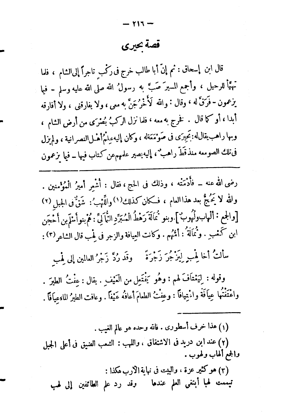 قَالَ ابْنُ إسْحَاقَ: ثُمّ إنّ أَبَا طَالِبٍ خَرَجَ فِي رَكْبٍ تَاجِرًا إلَى الشّامِ، فَلَمّا تَهَيّأَ لِلرّحِيلِ، وَأَجْمَعَ الْمَسِيرَ صَبّ به رسول الله صلى الله عليه وسلم- فيما يزعمون- فرقّ له، وَقَالَ: وَاَللهِ لَأَخْرُجَنّ بِهِ مَعِي، وَلَا يُفَارِقُنِي، وَلَا أُفَارِقُهُ أَبَدًا، أَوْ كَمَا قَالَ. فَخَرَجَ بِهِ مَعَهُ، فَلَمّا نَزَلَ الرّكْبُ بُصْرَى مِنْ أرض الشام، وبها راهب يُقَالُ لَهُ: بَحِيرَى فِي صَوْمَعَةٍ لَهُ، وَكَانَ إلَيْهِ عِلْمُ أَهْلِ النّصْرَانِيّةِ، وَلَمْ يَزَلْ فِي تِلْكَ الصّوْمَعَةِ مُنْذُ قَطّ رَاهِبٌ، إلَيْهِ يَصِيرُ علمهم عن كتاب فيها- فيما يزعمون