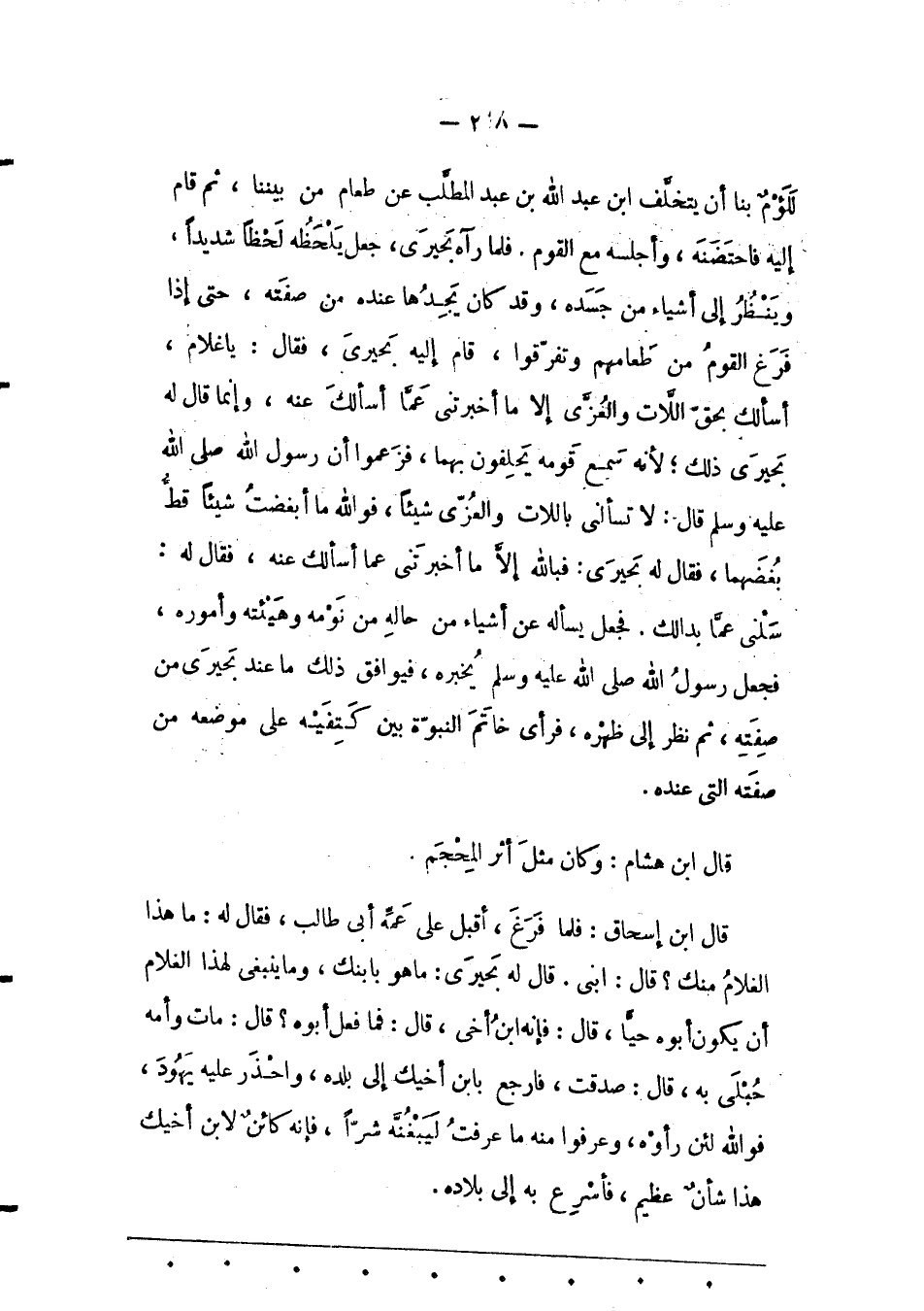 لَلُؤْمٌ بِنَا أَنْ يَتَخَلّفَ ابْنُ عَبْدِ اللهِ بن عبد المطّلب عن طعام من بيننا، ثم قام إليه فاحتضنه، وأجلسه مع القوم. فلما رَآهُ بَحِيرَى، جَعَلَ يَلْحَظُهُ لَحْظًا شَدِيدًا، وَيَنْظُرُ إلى أشياء من جسده، وقد كَانَ يَجِدُهَا عِنْدَهُ مِنْ صِفَتِهِ، حَتّى إذَا فَرَغَ الْقَوْمُ مِنْ طَعَامِهِمْ وَتَفَرّقُوا، قَامَ إلَيْهِ بحيرى، فقال: يا غلام، أسألك بحقّ اللّات وَالْعُزّى إلّا مَا أَخْبَرْتَنِي عَمّا أَسْأَلُكَ عَنْهُ، وَإِنّمَا قَالَ لَهُ بَحِيرَى ذَلِكَ؛ لِأَنّهُ سَمِعَ قَوْمَهُ يَحْلِفُونَ بِهِمَا، فَزَعَمُوا أَنّ رَسُولَ اللهِ صلى الله عليه وسلم قال: لا تسألنى باللات والعزّى شيئا، فو الله مَا أَبْغَضْتُ شَيْئًا قَطّ بُغْضَهُمَا، فَقَالَ لَهُ بَحِيرَى: فَبِاَللهِ إلّا مَا أَخْبَرْتَنِي عَمّا أَسْأَلُك عنه، فقال له: