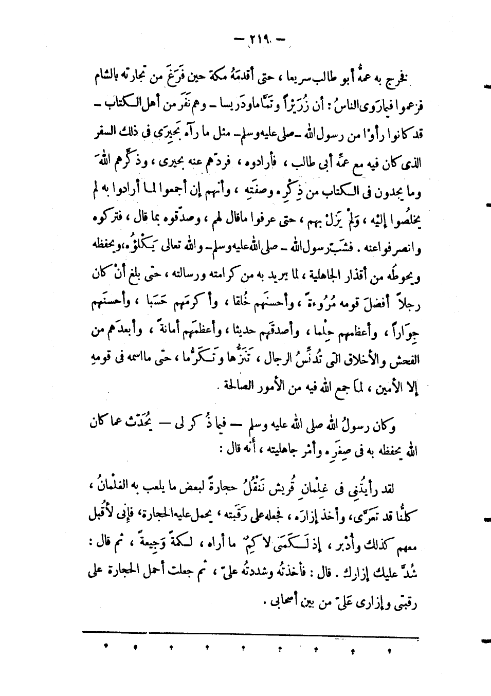 فخرج به عمّه أبو طالب سَرِيعًا، حَتّى أَقْدَمَهُ مَكّةَ حَيْنَ فَرَغَ مِنْ تِجَارَتِهِ بِالشّامِ فَزَعَمُوا فِيمَا رَوَى النّاسُ: أَنّ زُرَيْرًا وَتَمّامًا وَدَرِيسًا- وَهُمْ نَفَرٌ مِنْ أَهْلِ الكتاب- قد كانوا رأوا مِنْ رَسُولِ اللهِ- صَلَّى اللَّهُ عَلَيْهِ وَسَلَّمَ- مِثْلَ مَا رَآهُ بَحِيرَى فِي ذَلِكَ السّفَرِ الّذِي كَانَ فِيهِ مَعَ عَمّهِ أَبِي طَالِبٍ، فَأَرَادُوهُ، فَرَدّهُمْ عَنْهُ بَحِيرَى، وَذَكّرَهُمْ اللهَ وَمَا يَجِدُونَ فِي الْكِتَابِ مِنْ ذِكْرِهِ وَصِفَتِهِ، وَأَنّهُمْ إنْ أَجْمَعُوا لِمَا أَرَادُوا بِهِ لَمْ يَخْلُصُوا إلَيْهِ، وَلَمْ يَزَلْ بِهِمْ، حَتّى عَرَفُوا مَا قَالَ لَهُمْ، وَصَدّقُوهُ بِمَا قَالَ، فَتَرَكُوهُ وَانْصَرَفُوا عَنْهُ. فَشَبّ رَسُولُ اللهِ- صَلَّى اللَّهُ عَلَيْهِ وَسَلَّمَ- وَاَللهِ تَعَالَى يَكْلَؤُهُ، وَيَحْفَظُهُ وَيَحُوطُهُ مِنْ أَقْذَارِ الْجَاهِلِيّةِ، لِمَا يُرِيدُ بِهِ مِنْ كَرَامَتِهِ ورسالته، حتى بلغ أن كان رجلا أفضل قَوْمِهِ مُرُوءَةً، وَأَحْسَنَهُمْ خُلُقًا، وَأَكْرَمَهُمْ حَسَبًا، وَأَحْسَنَهُمْ جِوَارًا، وَأَعْظَمَهُمْ حِلْمًا، وَأَصْدَقَهُمْ حَدِيثًا، وَأَعْظَمَهُمْ أَمَانَةً، وَأَبْعَدَهُمْ مِنْ الْفُحْشِ وَالْأَخْلَاقِ الّتِي تُدَنّسُ الرّجَالَ، تَنَزّهًا وَتَكَرّمًا، حَتّى مَا اسْمُهُ فِي قَوْمِهِ إلّا الْأَمِينُ، لِمَا جَمَعَ اللهُ فِيهِ مِنْ الأمور الصالحة.
