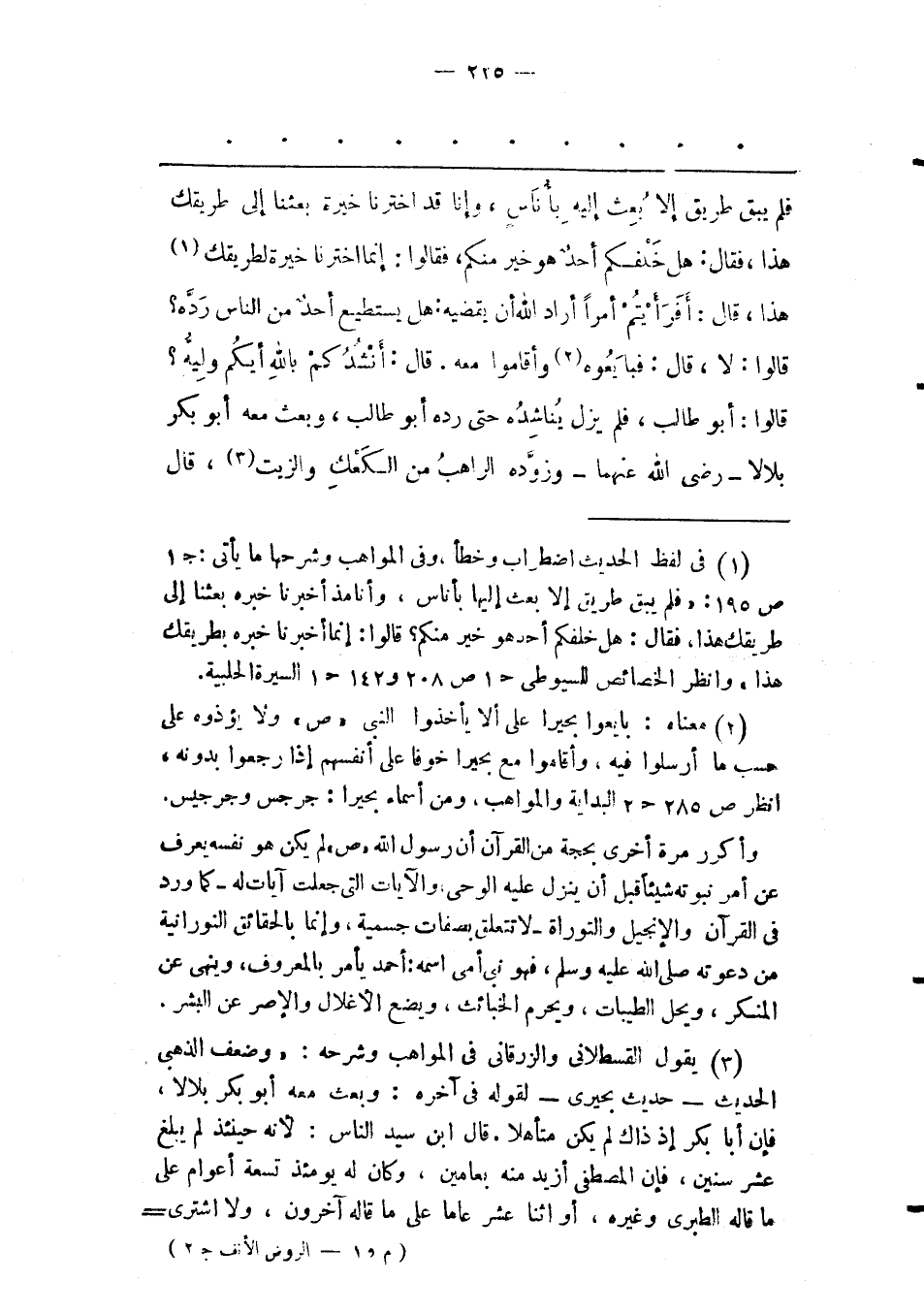 (3) يقول القسطلانى والزرقانى فى المواهب وشرحه: «وضعف الذهبى الحديث- حديث بحيرى- لقوله فى آخره: وبعث معه أبوبكر بلالا، فإن أبا بكر إذ ذاك لم يكن متأهلا. قال ابن سيد الناس: لأنه حينئذ لم يبلغ عشر سنين، فإن المصطفى أزيد منه بعامين، وكان له يومئذ تسعة أعوام على ما قاله الطبرى وغيره، أو اثنا عشر عاما على ما قاله آخرون، ولا اشترى