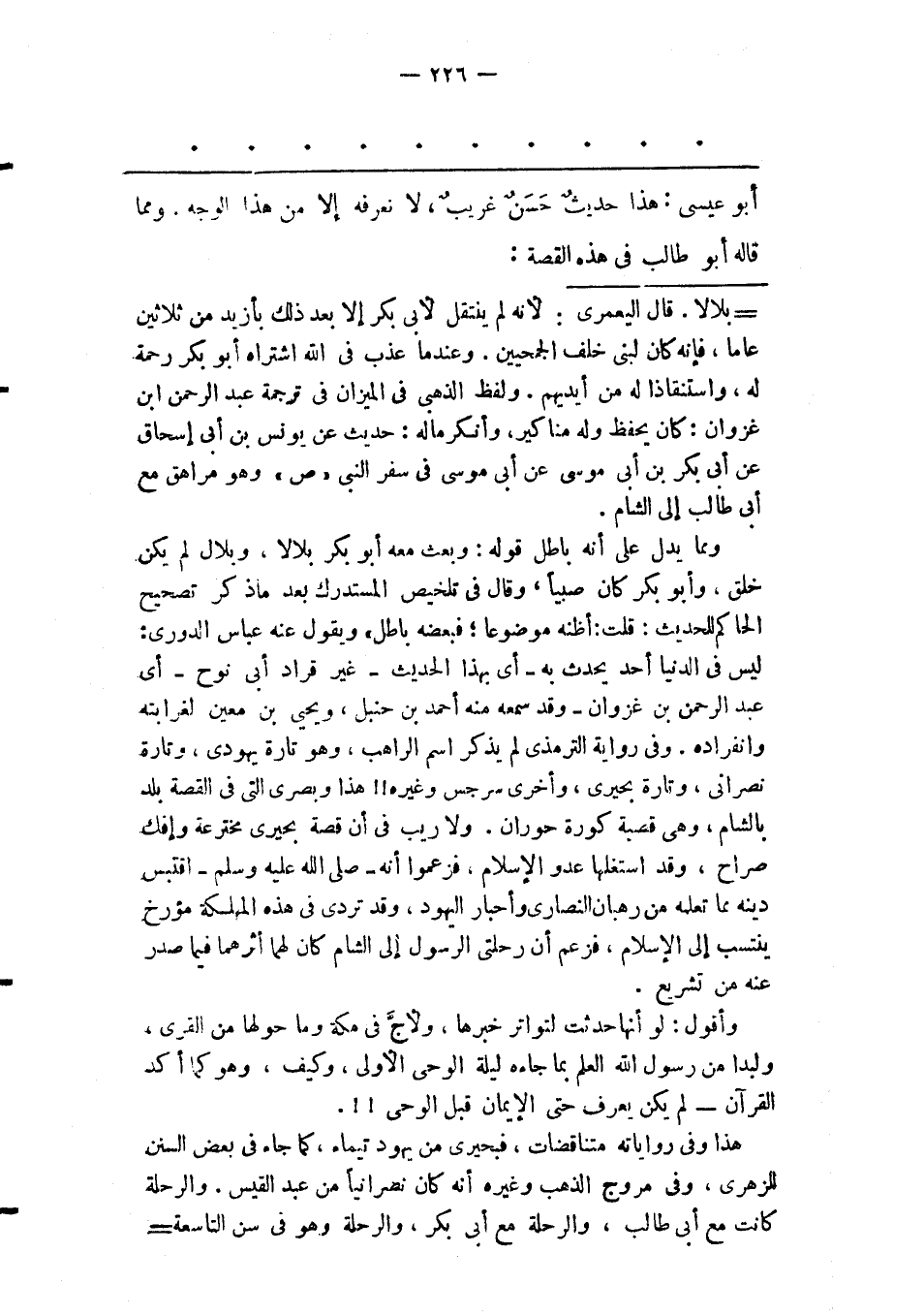 بلالا. قال اليعمرى: لأنه لم ينتقل لأبى بكر إلا بعد ذلك بأزيد من ثلاثين عاما، فإنه كان لبنى خلف الجمحيين. وعندما عذب فى الله اشتراه أبوبكر رحمة له، واستنقاذا له من أيديهم. ولفظ الذهبى فى الميزان فى ترجمة عبد الرحمن ابن غزوان: كان يحفظ وله مناكير، وأنكر ماله: حديث عن يونس بن أبى إسحاق عن أبى بكر بن أبى موسى عن أبى موسى فى سفر النبى «ص» وهو مراهق مع أبى طالب إلى الشام. ومما يدل على أنه باطل قوله: وبعث معه أبوبكر بلالا، وبلال لم يكن خلق، وأبوبكر كان صبيا، وقال فى تلخيص المستدرك بعد ما ذكر تصحيح الحاكم للحديث: قلت: أظنه موضوعا؛ فبعضه باطل» ويقول عنه عباس الدورى: ليس فى الدنيا أحد يحدث به- أى بهذا الحديث- غير قراد أبى نوح- أى عبد الرحمن بن غزوان- وقد سمعه منه أحمد بن حنبل، ويحيى بن معين لغرابته وانفراده. وفى رواية الترمذى لم يذكر اسم الراهب، وهو تارة يهودى، وتارة نصرانى، وتارة بحيرى، وأخرى سرجس وغيره!! هذا وبصرى التى فى القصة بلد بالشام، وهى قصبة كورة حوران. ولا ريب فى أن قصة بحيرى مخترعة وإفك صراح، وقد استغلها عدو الإسلام، فزعموا أنه- صلى الله عليه وسلم- اقتبس دينه مما تعلمه من رهبان النصارى وأحبار اليهود، وقد تردى فى هذه المهلكة مؤرخ ينتسب إلى الإسلام، فزعم أن رحلتى الرسول إلى الشام كان لهما أثر هما فيما صدر عنه من تشريع. وأقول: لو أنها حدثت لتواتر خبرها، ولأجّ فى مكة وما حولها من القرى، ولبدا من رسول الله العلم بما جاءه ليلة الوحى الأولى، وكيف، وهو كما أكد القرآن- لم يكن يعرف حتى الإيمان قبل الوحى!!. هذا وفى رواياته متناقضات، فبحيرى من يهود تيماء، كما جاء فى بعض السنن للزهرى، وفى مروج الذهب وغيره أنه كان نصرانيا من عبد القيس. والرحلة كانت مع أبى طالب، والرحلة مع أبى بكر، والرحلة وهو فى سن التاسعة