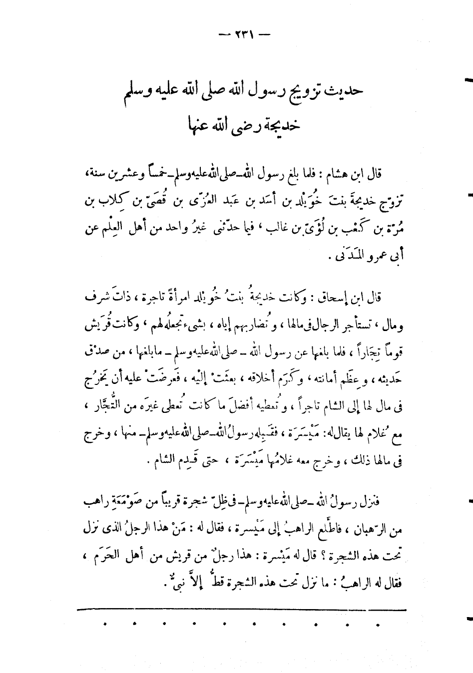 قَالَ ابْنُ هِشَامٍ: فَلَمّا بَلَغَ رَسُولُ اللهِ- صَلّى اللهُ عَلَيْهِ وَسَلّمَ- خَمْسًا وَعِشْرِينَ سَنَةً، تَزَوّجَ خَدِيجَةَ بِنْتَ خُوَيْلِدِ بْنِ أَسَدِ بْنِ عَبْدِ الْعُزّى بْنِ قصي بن كلاب بن مرة بن كعب بن لؤي بن غالب، فِيمَا حَدّثَنِي غَيْرُ وَاحِدٍ مِنْ أَهْلِ الْعِلْمِ عن أبى عمرو المدنى.