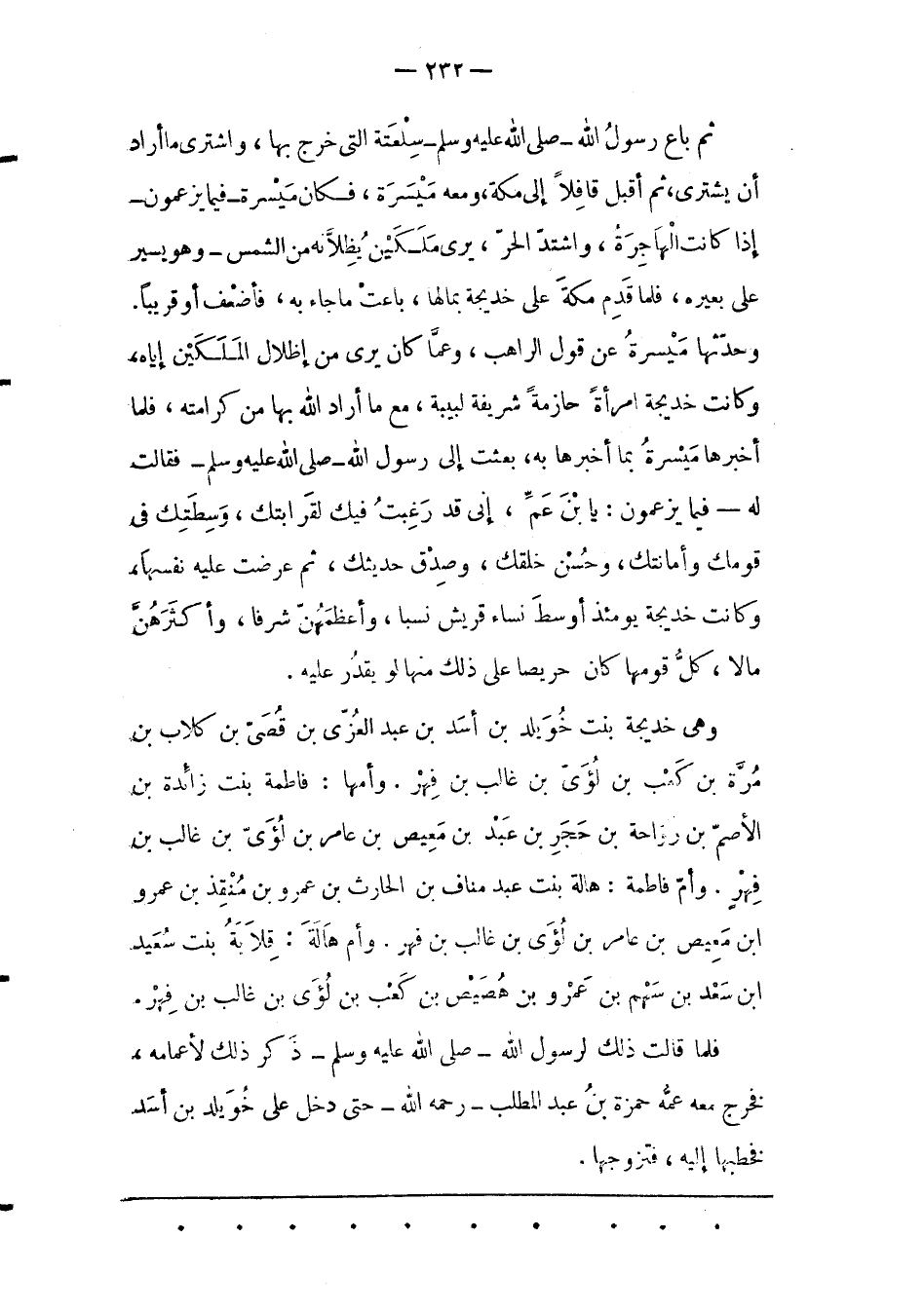 وحدّثها ميسرة عن قول الراهب، وَعَمّا كَانَ يَرَى مِنْ إظْلَالِ الْمَلَكَيْنِ إيّاهُ، وَكَانَتْ خَدِيجَةُ امْرَأَةً حَازِمَةً شَرِيفَةً لَبِيبَةً، مَعَ مَا أَرَادَ اللهُ بِهَا مِنْ كَرَامَتِهِ، فَلَمّا أَخْبَرَهَا مَيْسَرَةُ بِمَا أَخْبَرَهَا بِهِ، بَعَثَتْ إلَى رَسُولِ اللهِ- صَلَّى اللَّهُ عَلَيْهِ وَسَلَّمَ- فقالت له- فيما يزعمون: يا بن عَمّ، إنّي قَدْ رَغِبْتُ فِيك لِقَرَابَتِك، وَسِطَتِكَ فِي قَوْمِك وَأَمَانَتِك، وَحُسْنِ خُلُقِك، وَصِدْقِ حَدِيثِك، ثُمّ عَرَضَتْ عَلَيْهِ نَفْسَهَا، وَكَانَتْ خَدِيجَةُ يَوْمئِذٍ أَوْسَطَ نِسَاءِ قُرَيْشٍ نَسَبًا، وَأَعْظَمَهُنّ شَرَفًا، وَأَكْثَرَهُنّ مَالًا، كُلّ قَوْمِهَا كَانَ حَرِيصًا عَلَى ذَلِكَ منها لو يقدر عليه.