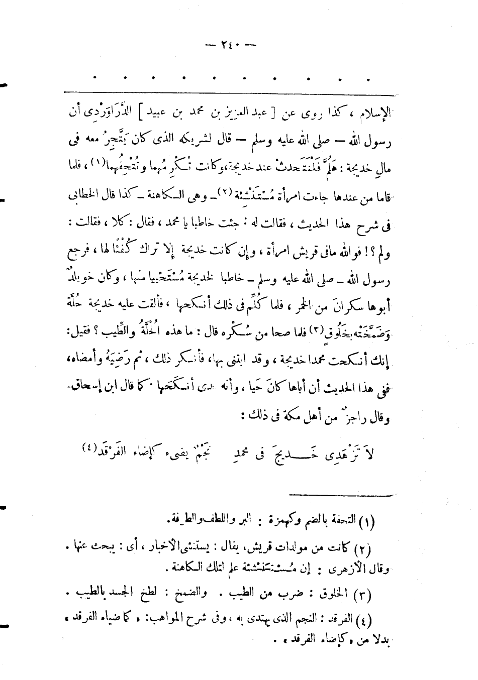 الْإِسْلَامِ، كَذَا رُوِيَ عَنْ [عَبْدِ الْعَزِيزِ بْنِ مُحَمّدِ بْنِ عُبَيْدٍ] الدّرَاوَرْدِيّ أَنّ رَسُولَ اللهِ- صَلَّى اللَّهُ عَلَيْهِ وَسَلَّمَ- قَالَ لِشَرِيكِهِ الّذِي كَانَ يَتّجِرُ مَعَهُ فِي مَالِ خَدِيجَةَ: هَلُمّ فَلْنَتَحَدّثْ عِنْدَ خَدِيجَةَ، وَكَانَتْ تُكْرِمُهُمَا وَتُتْحِفُهُمَا «1» ، فَلَمّا قَامَا مِنْ عِنْدِهَا جَاءَتْ امْرَأَةٌ مُسْتَنْشِئَةٌ «2» - وَهِيَ الْكَاهِنَةُ- كَذَا قَالَ الْخَطّابِيّ فِي شَرْحِ هَذَا الْحَدِيثِ، فَقَالَتْ لَهُ: جِئْت خَاطِبًا يَا مُحَمّدُ، فقال: كلا، فقالت:
