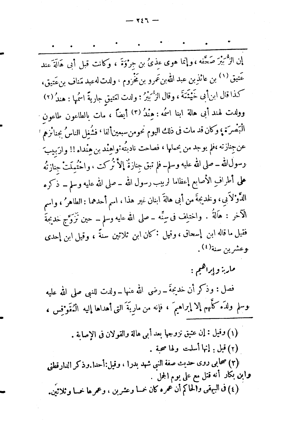 إن الزّبير صحّفه، وإنما هوى عِذْيُ بْنُ جَرْوَةَ، وَكَانَتْ قَبْلَ أَبِي هَالَةَ عِنْدَ عَتِيقِ «1» بْنِ عَائِذِ بْنِ عَبْدِ اللهِ بْنِ عَمْرِو بْنِ مَخْزُومٍ، وَلَدَتْ لَهُ عَبْدَ مَنَافِ بْنِ عَتِيقٍ، كَذَا قَالَ ابْنُ أَبِي خَيْثَمَةَ، وَقَالَ الزّبَيْرُ: وَلَدَتْ لِعَتِيقِ جَارِيَةً اسْمُهَا: هِنْدٌ «2» وَوَلَدَتْ لِهِنْدِ أَبِي هَالَةَ ابْنًا اسْمُهُ: هِنْدٌ «3» أَيْضًا، مَاتَ بِالطّاعُونِ طَاعُونِ الْبَصْرَةِ، وَكَانَ قَدْ مَاتَ فِي ذَلِكَ الْيَوْمِ نَحْوٌ مِنْ سَبْعِينَ أَلْفًا، فَشُغِلَ النّاسُ بِجَنَائِزِهِمْ عَنْ جِنَازَتِهِ، فَلَمْ يُوجَدْ مَنْ يَحْمِلُهَا، فَصَاحَتْ نَادِبَتُهُ: وَاهِنْدُ بْنَ هِنْدَاهُ!! وَارَبِيبَ رَسُولِ اللهِ- صَلَّى اللَّهُ عَلَيْهِ وَسَلَّمَ- فَلَمْ تَبْقَ جِنَازَةٌ إلّا تُرِكَتْ، وَاحْتُمِلَتْ جِنَازَتُهُ عَلَى أَطْرَافِ الْأَصَابِعِ إعْظَامًا لِرَبِيبِ رَسُولِ اللهِ- صَلَّى اللَّهُ عَلَيْهِ وَسَلَّمَ- ذَكَرَهُ الدّولَابِيّ، وَلِخَدِيجَةَ مِنْ أَبِي هَالَةَ ابْنَانِ غَيْرَ هَذَا، اسْمُ أَحَدِهِمَا: الطّاهِرُ، وَاسْمُ الْآخَرِ: هَالَةُ. وَاخْتُلِفَ فِي سِنّهِ- صَلَّى اللَّهُ عَلَيْهِ وَسَلَّمَ- حِينَ تَزَوّجَ خَدِيجَةَ فَقِيلَ مَا قَالَهُ ابْنُ إسْحَاقَ، وَقِيلَ: كَانَ ابْنَ ثَلَاثِينَ سَنَةً، وَقِيلَ ابْنَ إحْدَى وَعِشْرِينَ سَنَةً «4» .