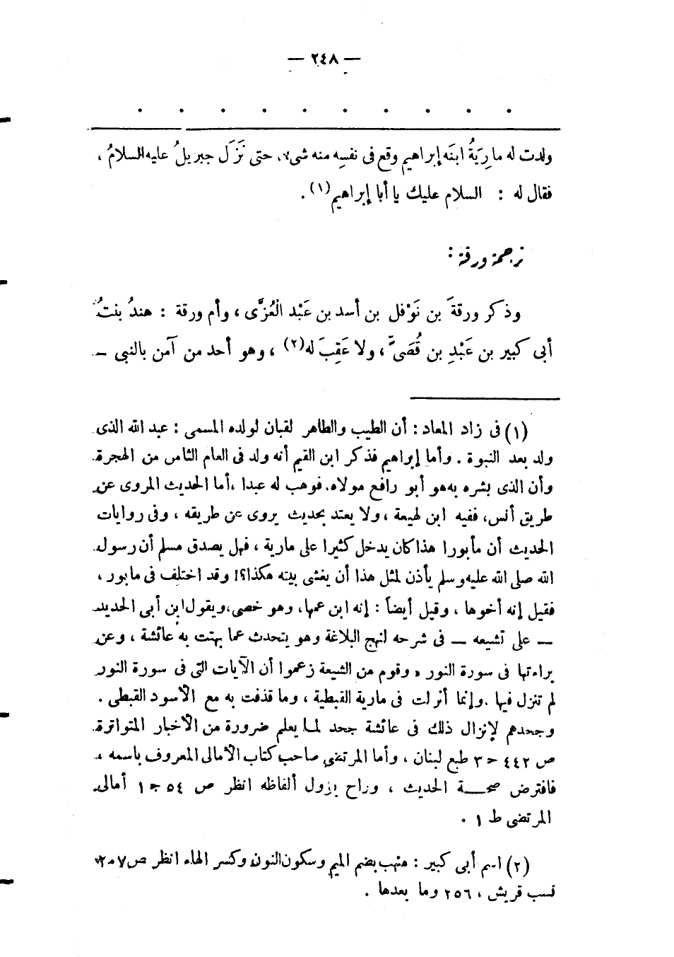 (1) فى زاد المعاد: أن الطيب والطاهر لقبان لولده المسمى: عبد الله الذى ولد بعد النبوة. وأما إبراهيم فذكر ابن القيم أنه ولد فى العام الثامن من الهجرة وأن الذى بشره به هو أبو رافع مولاه، فوهب له عبدا، أما الحديث المروى عن طريق أنس، ففيه ابن لهيعة، ولا يعتد بحديث يروى عن طريقه، وفى روايات الحديث أن مأبورا هذا كان يدخل كثيرا على مارية، فهل يصدق مسلم أن رسول الله صلى الله عليه وسلم يأذن لمثل هذا أن يغشى بيته هكذا؟! وقد اختلف فى مابور، فقيل إنه أخوها، وقيل أيضا: إنه ابن عمها، وهو خصى، ويقول ابن أبى الحديد- على تشيعه- فى شرحه لنهج البلاغة وهو يتحدث عما بهتت به عائشة، وعن براءتها فى سورة النور «وقوم من الشيعة زعموا أن الايات التى فى سورة النور لم تنزل فيها، وإنما أنزلت فى مارية القبطية، وما قدفت به مع الأسود القبطى. وجحدهم لإنزال ذلك فى عائشة جحد لما يعلم ضرورة من الأخبار المتواترة ص 442 ح 3 طبع لبنان، وأما المرتضى صاحب كتاب الأمالى المعروف باسمه، فافترض صحة الحديث، وراح يؤول ألفاظه انظر ص 54 ج 1 أمالى المرتضى ط 1.