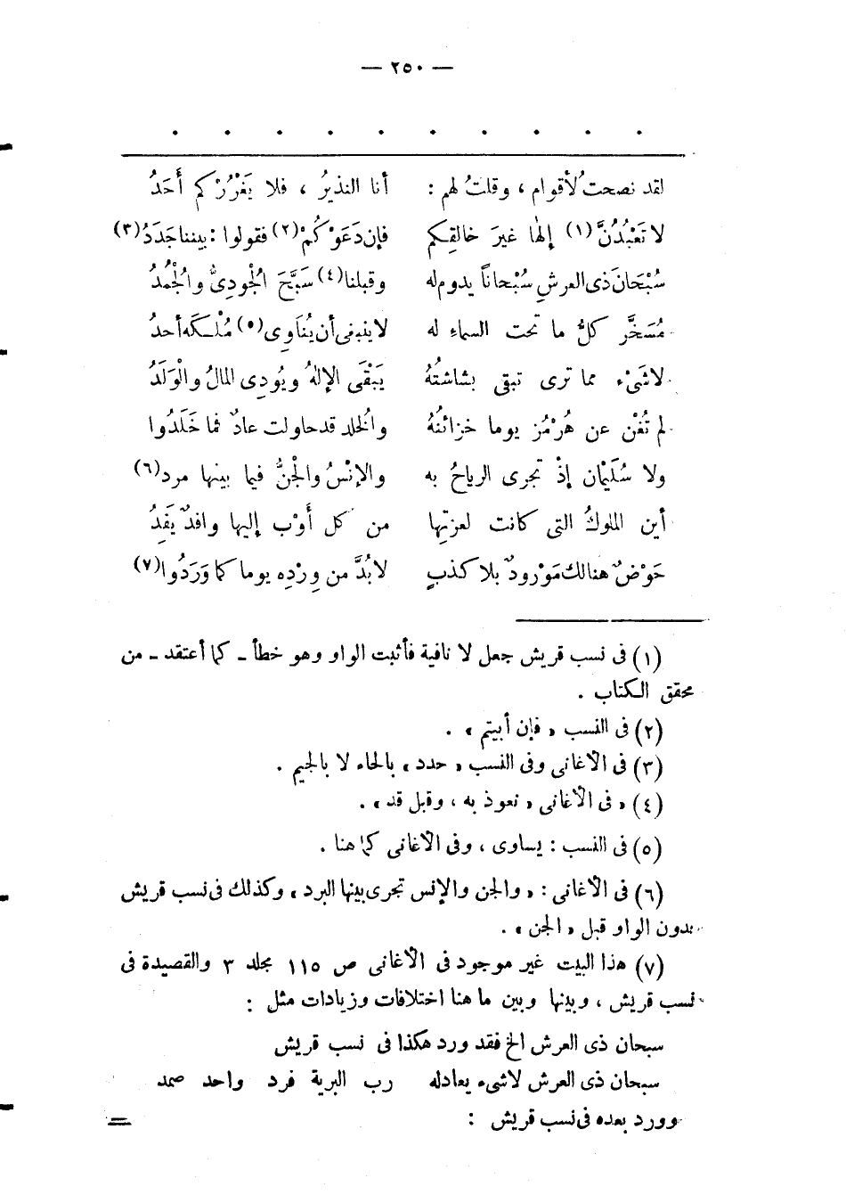 (7) هذا البيت غير موجود فى الأغانى ص 115 مجلد 3 والقصيدة فى نسب قريش، وبينها وبين ما هنا اختلافات وزيادات مثل: سبحان ذى العرش الخ فقد ورد هكذا فى نسب قريش