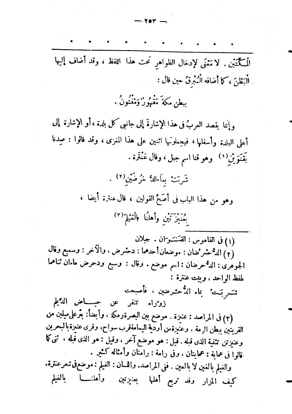 وَإِنّمَا يَقْصِدُ الْعَرَبُ فِي هَذَا الْإِشَارَةَ إلَى جَانِبَيْ كُلّ بَلْدَةٍ، أَوْ الْإِشَارَةَ إلَى أَعْلَى الْبَلْدَةِ وَأَسْفَلِهَا، فَيَجْعَلُونَهَا اثْنَيْنِ عَلَى هَذَا الْمَغْزَى، وَقَدْ قَالُوا: صِدْنَا بِقَنَوَيْنِ «1» وَهُوَ قَنَا اسْمُ جبل، وقال عنترة.