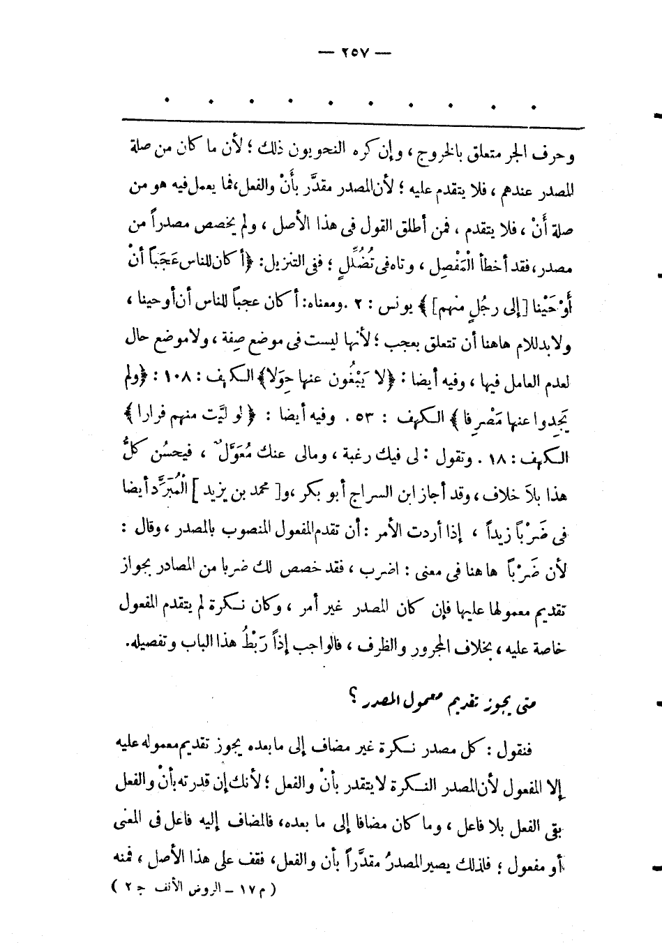 وَحَرْفُ الْجَرّ مُتَعَلّقٌ بِالْخُرُوجِ، وَإِنْ كَرِهَ النّحْوِيّونَ ذَلِكَ؛ لِأَنّ مَا كَانَ مِنْ صِلَةِ الْمَصْدَرِ عِنْدَهُمْ، فَلَا يَتَقَدّمُ عَلَيْهِ؛ لِأَنّ الْمَصْدَرَ مُقَدّرٌ بِأَنْ وَالْفِعْلِ، فَمَا يَعْمَلُ فِيهِ هُوَ مِنْ صِلَةِ أَنْ، فَلَا يَتَقَدّمُ، فَمَنْ أَطْلَقَ الْقَوْلَ فِي هَذَا الْأَصْلِ، وَلَمْ يُخَصّصْ مَصْدَرًا مِنْ مَصْدَرٍ، فَقَدْ أَخْطَأَ الْمُفَصّلَ، وَتَاهَ فِي تُضُلّلٍ؛ فَفِي التّنْزِيلِ: أَكانَ لِلنَّاسِ عَجَباً أَنْ أَوْحَيْنا [إِلى رَجُلٍ مِنْهُمْ] يُونُسُ: 2. وَمَعْنَاهُ: أَكَانَ عَجَبًا لِلنّاسِ أَنْ أَوْحَيْنَا، وَلَا بُدّ لِلّامِ هَاهُنَا أَنْ تَتَعَلّقَ بِعَجَبِ؛ لِأَنّهَا لَيْسَتْ فِي مَوْضِعِ صِفَةٍ، وَلَا مَوْضِعِ حَالٍ لِعَدِمِ الْعَامِلِ فِيهَا، وَفِيهِ أَيْضًا: لَا يَبْغُونَ عَنْها حِوَلًا الْكَهْفُ: 108: وَلَمْ يَجِدُوا عَنْها مَصْرِفاً الْكَهْفُ: 53. وَفِيهِ أَيْضًا: لَوَلَّيْتَ مِنْهُمْ فِراراً الْكَهْفُ: 18. وَتَقُولُ: لِي فِيك رغبة، ومالى عَنْك مُعَوّلٌ، فَيَحْسُنُ كُلّ هَذَا بِلَا خِلَافٍ، وقد أجاز ابن السراج أبوبكر، و [مُحَمّدُ بْنُ يَزِيدَ] الْمُبَرّدُ أَيْضًا فِي ضَرْبًا زَيْدًا، إذَا أَرَدْت الْأَمْرَ: أَنْ تُقَدّمَ الْمَفْعُولَ الْمَنْصُوبَ بِالْمَصْدَرِ، وَقَالَ: