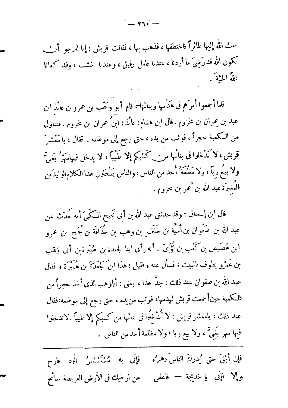 قال ابْنُ إسْحَاقَ: وَقَدْ حَدّثَنِي عَبْدُ اللهِ بْنُ أَبِي نَجِيحٍ الْمَكّيّ أَنّهُ حُدّثَ عَنْ عَبْدِ اللهِ بْنِ صَفْوَانَ بْنِ أُمّيّةَ بْنِ خَلَفِ بْنِ وَهْبِ بْنِ حُذَافَةَ بْنِ جمح بن عمرو ابن هُصَيْصِ بْنِ كَعْبِ بْنِ لُؤَيّ. أَنّهُ رَأَى ابْنًا لِجَعْدَةَ بْنِ هُبَيْرَةَ بْنِ أَبِي وَهْبِ بْنِ عَمْرِو يَطُوفُ بِالْبَيْتِ، فَسَأَلَ عَنْهُ، فَقِيلَ: هَذَا ابْنٌ لِجَعْدَةَ بْنِ هُبَيْرَةَ، فَقَالَ عَبْدُ اللهِ بْنُ صَفْوَانَ عِنْدَ ذَلِكَ: جَدّ هَذَا، يَعْنِي: أَبَا وَهْبٍ الّذِي أَخَذَ حَجَرًا مِنْ الْكَعْبَةِ حَيْنَ أَجْمَعَتْ قُرَيْشٌ لِهَدْمِهَا، فَوَثَبَ مِنْ يَدِهِ، حَتّى رَجَعَ إلَى مَوْضِعِهِ، فَقَالَ عِنْدَ ذَلِكَ: يَا مَعْشَرَ قُرَيْشٍ: لَا تُدْخِلُوا فِي بِنَائِهَا مِنْ كَسْبِكُمْ إلّا طَيّبًا. لَا تُدْخِلُوا فيها مهر بغي، ولا بيع ربا، ولا مظلمة أحد من الناس.