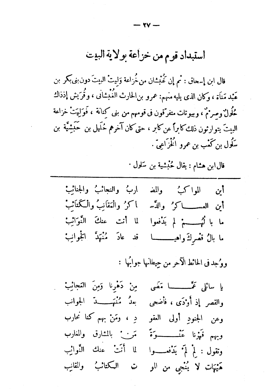 قَالَ ابْنُ إسْحَاقَ: ثُمّ إنّ غُبْشَانَ مِنْ خُزَاعَةَ وَلِيَتْ الْبَيْتَ دُونَ بَنِي بَكْرِ بْنِ عَبْدِ مَنَاةَ، وَكَانَ الّذِي يَلِيهِ مِنْهُمْ: عَمْرُو بْنُ الْحَارِثِ الْغُبْشَانِيّ، وَقُرَيْشٌ إذْ ذَاكَ حُلُولٌ وَصِرَمٌ، وَبُيُوتَاتٌ مُتَفَرّقُونَ فِي قَوْمِهِمْ مِنْ بَنِي كِنَانَةَ، فَوَلِيَتْ خُزَاعَةُ الْبَيْتَ يَتَوَارَثُونَ ذَلِكَ كَابِرًا عَنْ كَابِرٍ، حَتّى كَانَ آخِرُهُمْ حُلَيْلُ بْنِ حُبْشِيّةَ بْنِ سَلُولَ بْنِ كَعْبِ بْنِ عمرو الخزاعي.