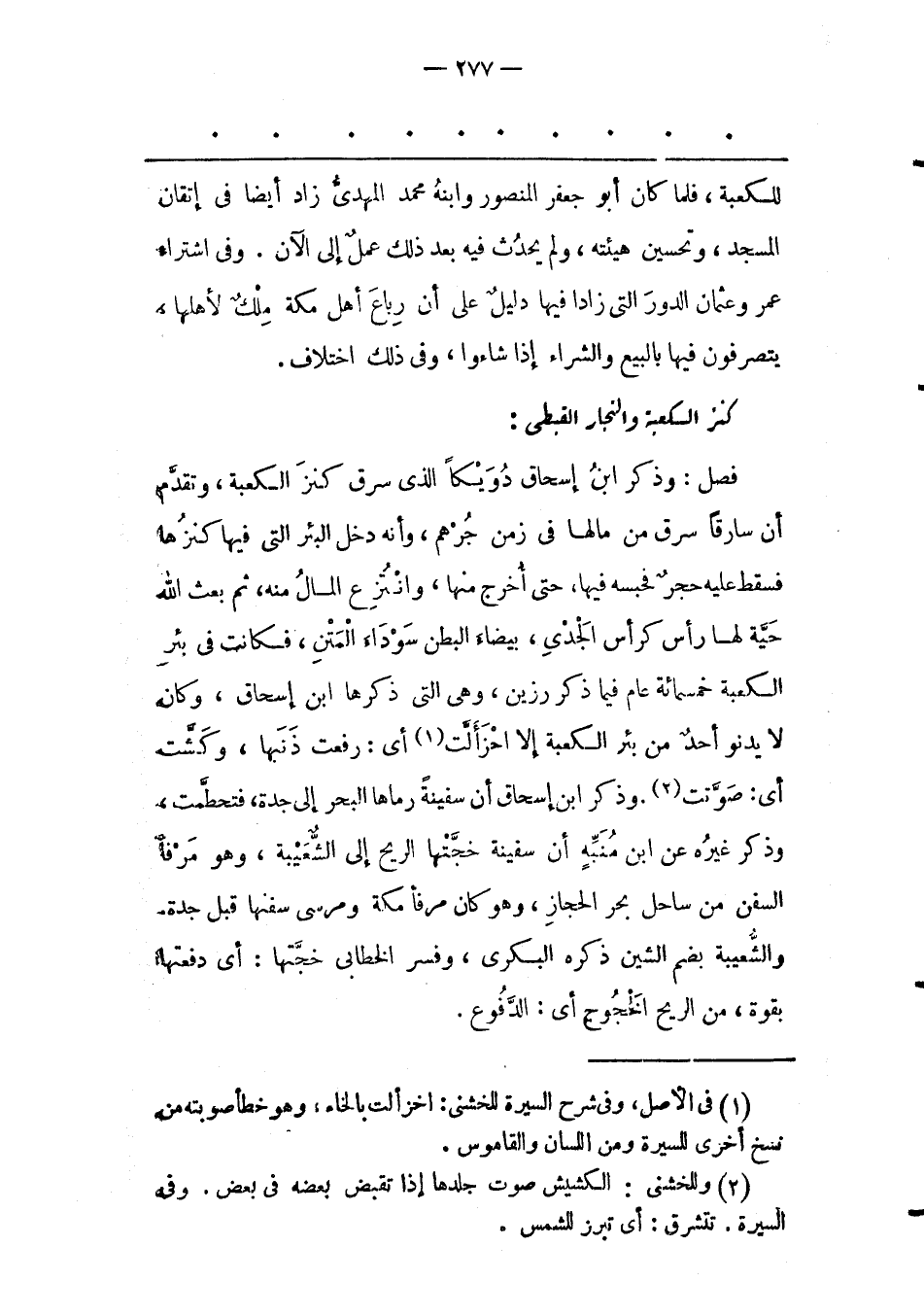 فَصْلٌ: وَذَكَرَ ابْنُ إسْحَاقَ دُوَيْكًا الّذِي سَرَقَ كَنْزَ الْكَعْبَةِ، وَتَقَدّمَ أَنّ سَارِقًا سَرَقَ مِنْ مَالِهَا فِي زَمَنِ جُرْهُمَ، وَأَنّهُ دَخَلَ الْبِئْرَ الّتِي فِيهَا كَنْزُهَا فَسَقَطَ عَلَيْهِ حَجَرٌ فَحَبَسَهُ فِيهَا، حَتّى أُخْرِجَ مِنْهَا، وَانْتُزِعَ الْمَالُ مِنْهُ، ثُمّ بَعَثَ اللهُ حَيّةً لَهَا رَأْسٌ كَرَأْسِ الْجَدْيِ، بَيْضَاءُ الْبَطْنِ سَوْدَاءُ الْمَتْنِ، فَكَانَتْ فِي بِئْرِ الْكَعْبَةِ خَمْسَمِائَةِ عَامٍ فِيمَا ذَكَرَ رَزِينٌ، وَهِيَ الّتِي ذَكَرَهَا ابْنُ إسْحَاقَ، وَكَانَ لَا يَدْنُو أَحَدٌ مِنْ بِئْرِ الْكَعْبَةِ إلّا احْزَأَلّتْ «1» أَيْ: رَفَعَتْ ذَنَبَهَا، وَكَشّتْ أَيْ: صَوّتَتْ «2» . وَذَكَرَ ابْنُ إسْحَاقَ أَنّ سَفِينَةً رَمَاهَا الْبَحْرُ إلَى جَدّةَ، فَتَحَطّمَتْ، وَذَكَرَ غَيْرُهُ عَنْ ابْنِ مُنَبّهٍ أَنّ سَفِينَةً خَجّتْهَا الرّيحُ إلَى الشّعَيْبَةِ، وَهُوَ مَرْفَأُ السّفُنِ مِنْ سَاحِلِ بَحْرِ الْحِجَازِ، وَهُوَ كَانَ مَرْفَأَ مَكّةَ وَمَرْسَى سُفُنِهَا قَبْلَ جَدّةَ.