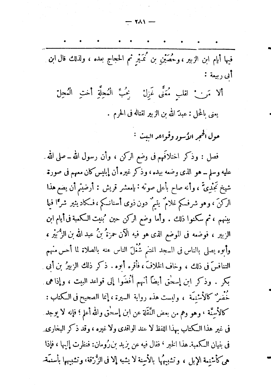 فَصْلٌ: وَذَكَرَ اخْتِلَافَهُمْ فِي وَضْعِ الرّكْنِ، وَأَنّ رَسُولَ اللهِ- صَلَّى اللَّهُ عَلَيْهِ وَسَلَّمَ- هُوَ الّذِي وَضَعَهُ بِيَدِهِ، وَذَكَرَ غَيْرُهُ أَنّ إبْلِيسَ كَانَ مَعَهُمْ فِي صُورَةِ شَيْخٍ نَجْدِيّ، وَأَنّهُ صَاحَ بِأَعْلَى صَوْتِهِ: يَا مَعْشَرَ قُرَيْشٍ: أَرَضِيتُمْ أَنْ يَضَعَ هَذَا الرّكْنَ، وَهُوَ شَرَفُكُمْ غُلَامٌ يَتِيمٌ دُونَ ذَوِي أَسْنَانِكُمْ، فكاد يُثِيرُ شَرّا فِيمَا بَيْنَهُمْ، ثُمّ سَكَنُوا ذَلِكَ. وَأَمّا وَضْعُ الرّكْنِ حِينَ بُنِيَتْ الْكَعْبَةُ فِي أَيّامِ ابْنِ الزّبَيْرِ، فَوَضَعَهُ فِي الْمَوْضِعِ الّذِي هُوَ فِيهِ الْآنَ حَمْزَةُ بْنُ عَبْدِ اللهِ بْنِ الزّبَيْرِ، وَأَبُوهُ يُصَلّي بِالنّاسِ فِي الْمَسْجِدِ اغْتَنَمَ شُغْلَ النّاسِ عَنْهُ بِالصّلَاةِ لَمّا أَحَسّ مِنْهُمْ التّنَافُسَ فِي ذَلِكَ، وَخَافَ الْخِلَافَ، فَأَقَرّهُ أَبُوهُ. ذَكَرَ ذَلِكَ الزّبَيْرُ بْنُ أَبِي بَكْرٍ. وذكر ابن إسحق أَيْضًا أَنّهُمْ أَفْضَوْا إلَى قَوَاعِدِ الْبَيْتِ، وَإِذَا هِيَ خُضْرٌ كَالْأَسْنِمَةِ، وَلَيْسَتْ هَذِهِ رِوَايَةَ السّيرَةِ، إنّمَا الصّحِيحُ فِي الْكِتَابِ: