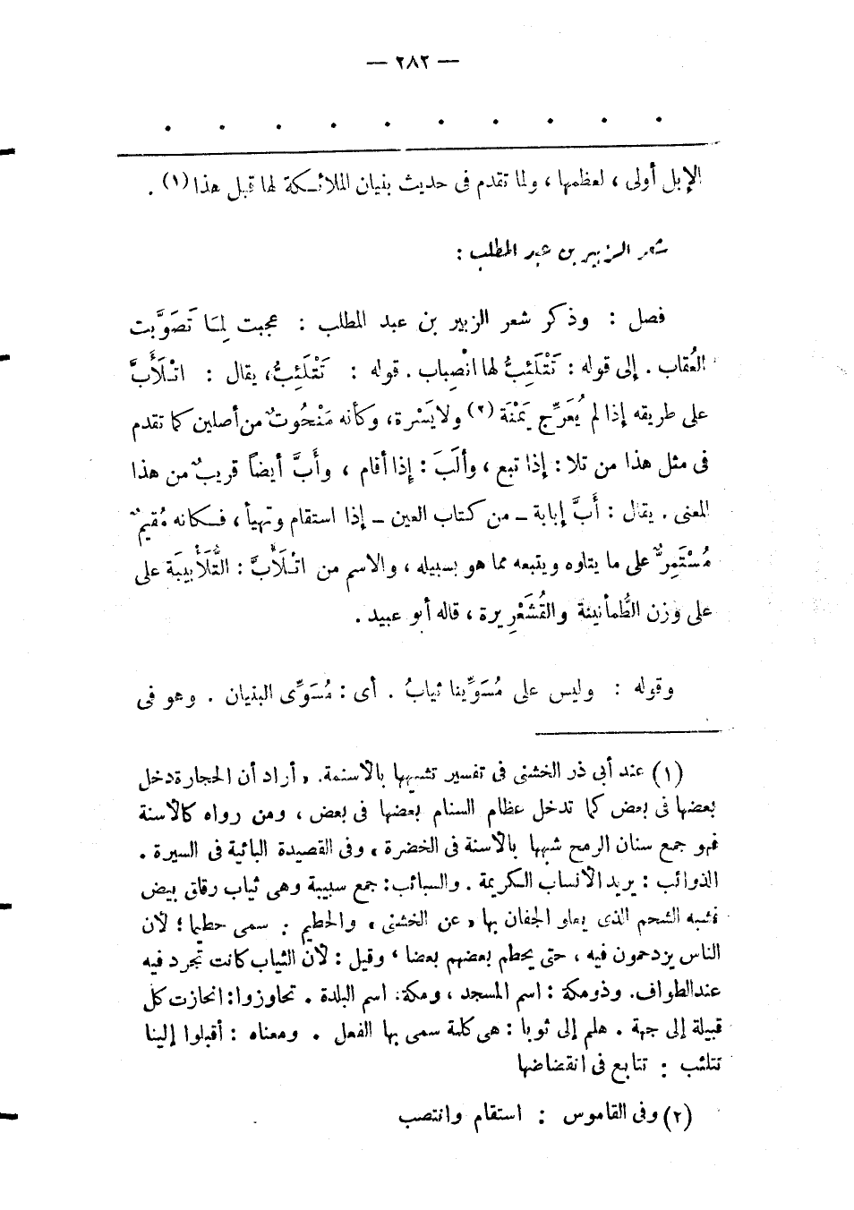 (1) عند أبى ذر الخشنى فى تفسير تشبيهها بالأسنمة. «أراد أن الحجارة دخل بعضها فى بعض كما تدخل عظام السنام بعضها فى بعض، ومن رواه كالأسنة فهو جمع سنان الرمح شبهها بالأسنة فى الخضرة» وفى القصيدة البائية فى السيرة. الذوائب: يريد الأنساب الكريمة. والسبائب: جمع سبيبة وهى ثياب رقاق بيض فشبه الشحم الذى يعلو الجفان بها «عن الخشنى» والحطيم: سمى حطيما؛ لأن الناس يزدحمون فيه، حتى يحطم بعضهم بعضا، وقيل: لأن الثياب كانت تجرد فيه عند الطواف. وذومكة: اسم المسجد، ومكة: اسم البلدة. تحاوزوا: انحازت كل قبيلة إلى جهة. هلم إلى ثوبا: هى كلمة سمى بها الفعل. ومعناه: أقبلوا إلينا تتلئب: تتابع فى انقضاضها