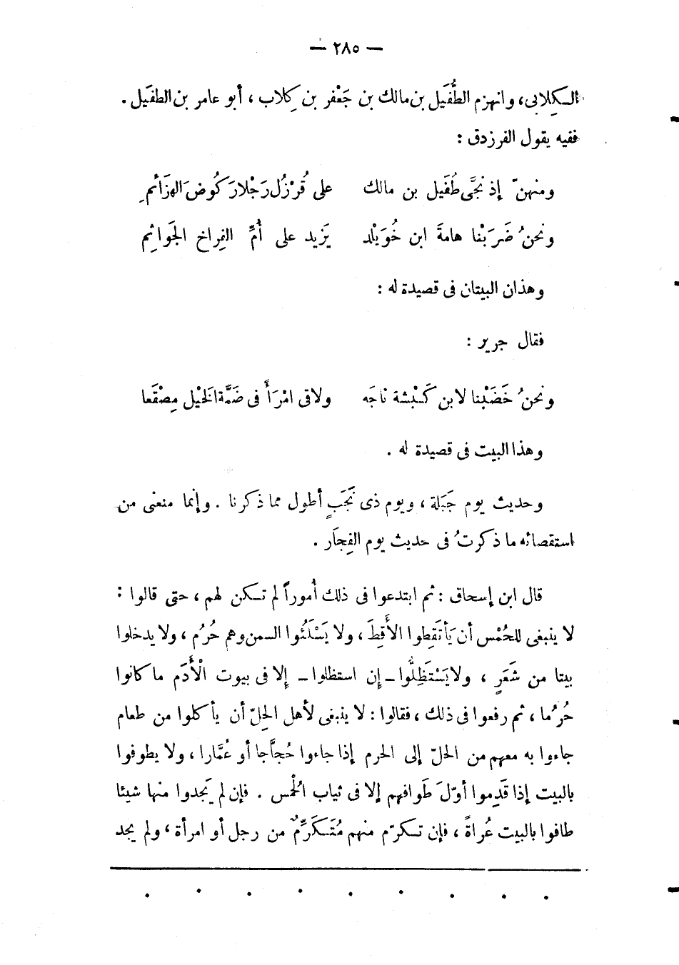 لَا يَنْبَغِي لِلْحُمْسِ أَنْ يَأْتَقِطُوا الْأَقِطَ، وَلَا يَسْلَئُوا السّمْنَ وَهُمْ حُرُمٌ، وَلَا يَدْخُلُوا بَيْتًا مِنْ شَعَرٍ، وَلَا يَسْتَظِلّوا- إنْ اسْتَظَلّوا- إلّا فِي بُيُوتِ الْأَدَمِ مَا كَانُوا حُرُمًا، ثُمّ رَفَعُوا فِي ذَلِكَ، فَقَالُوا: لَا يَنْبَغِي لأهل الحلّ أن يأكلوا من طعام جاؤا بِهِ مَعَهُمْ مِنْ الْحِلّ إلَى الْحَرَمِ إذَا جاؤا حُجّاجًا أَوْ عُمّارًا، وَلَا يَطُوفُوا بِالْبَيْتِ إذَا قَدِمُوا أَوّلَ طَوَافِهِمْ إلّا فِي ثِيَابِ الْحُمْسِ. فَإِنّ لَمْ يَجِدُوا مِنْهَا شَيْئًا طَافُوا بِالْبَيْتِ عُرَاةً، فَإِنْ تَكَرّمَ مِنْهُمْ مُتَكَرّمٌ مِنْ رَجُلٍ أَوْ امْرَأَةٍ، وَلَمْ يَجِدْ
