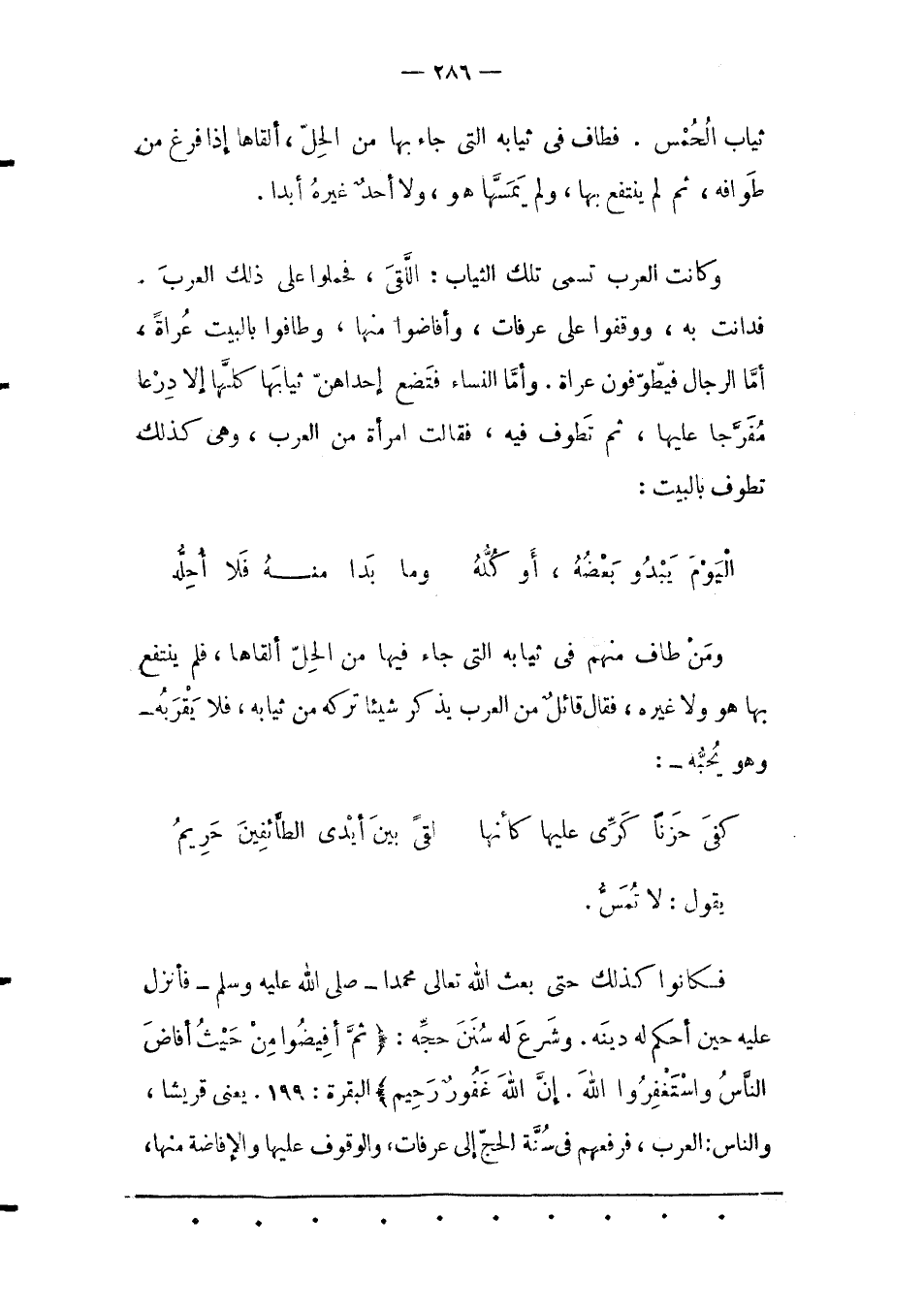 فَكَانُوا كَذَلِكَ حَتّى بَعَثَ اللهُ تَعَالَى مُحَمّدًا- صَلّى اللهُ عَلَيْهِ وَسَلّمَ- فَأَنْزَلَ عَلَيْهِ حَيْنَ أَحْكَمَ لَهُ دِينَهُ. وَشَرَعَ لَهُ سُنَنَ حَجّهِ: ثُمَّ أَفِيضُوا مِنْ حَيْثُ أَفاضَ النَّاسُ وَاسْتَغْفِرُوا اللَّهَ. إِنَّ اللَّهَ غَفُورٌ رَحِيمٌ البقرة: 199. يَعْنِي قُرَيْشًا، وَالنّاسُ: الْعَرَبُ، فَرَفَعَهُمْ فِي سُنّةِ الْحَجّ إلَى عَرَفَاتٍ، وَالْوُقُوفِ عَلَيْهَا وَالْإِفَاضَةِ مِنْهَا،