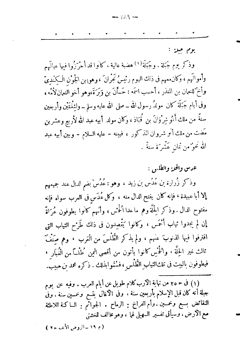 وَذَكَرَ يَوْمَ جَبَلَةَ. وَجَبَلَةُ «1» هَضْبَةٌ عَالِيَةٌ، كَانُوا قَدْ أَحْرَزُوا فِيهَا عِيَالَهُمْ وَأَمْوَالَهُمْ، وَكَانَ مَعَهُمْ فِي ذَلِكَ الْيَوْمِ رَئِيسُ نَجْرَانَ، وَهُوَ ابْنُ الْجَوْنِ الْكِنْدِيّ وَأَخٌ لِلنّعْمَانِ بْنِ الْمُنْذِرِ، أَحْسَبُ اسْمُهُ: حَسّانُ بْنُ وَبَرَةَ، وَهُوَ أَخُو النّعْمَانِ لِأُمّهِ، وَفِي أَيّامِ جَبَلَةَ كَانَ مولد رسول الله- صلى الله عليه وسلم- وَلِثِنْتَيْنِ وَأَرْبَعِينَ سَنَةً مِنْ مُلْكِ أَنُوشِرْوَانَ بْنِ قُبَاذٍ، وَكَانَ مَوْلِدُ أَبِيهِ عَبْدِ اللهِ لِأَرْبَعِ وَعِشْرِينَ مَضَتْ مِنْ مُلْكِ أَنُوشِرْوَانَ الْمَذْكُورِ، فَبَيْنَهُ- عَلَيْهِ السّلَامُ- وَبَيْنَ أَبِيهِ عَبْدِ اللهِ نَحْوٌ مِنْ ثَمَانِ عَشْرَةَ سَنَةً.