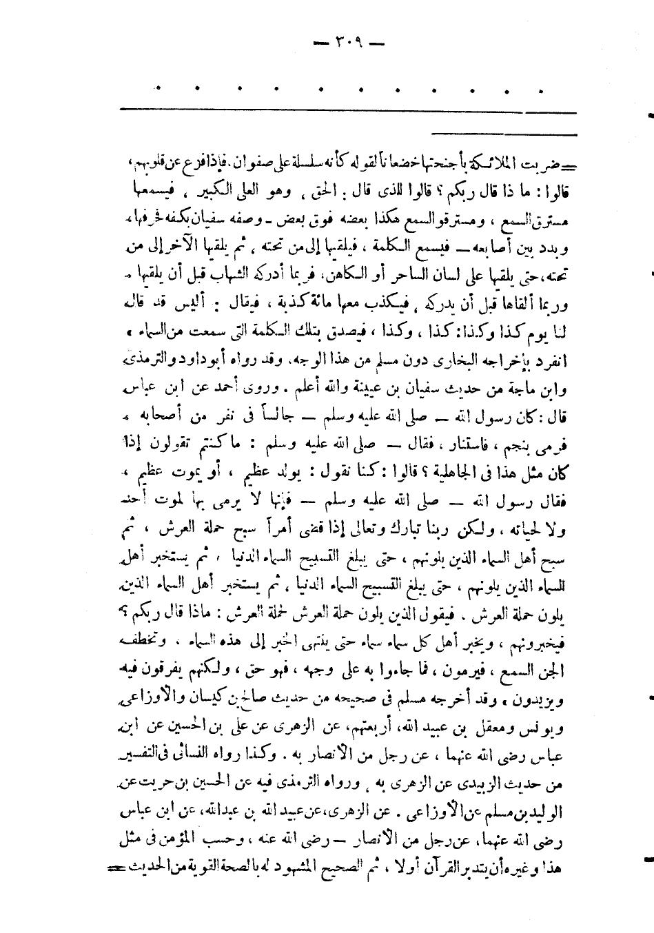 فيخبرونهم، ويخبر أهل كل سماء سماء حتى ينتهى الخبر إلى هذه السماء، وتخطف الجن السمع، فيرمون، فما جاؤا به على وجهه، فهو حق، ولكنهم يفرقون فيه ويزيدون» وقد أخرجه مسلم فى صحيخه من حديث صالح بن كيسان والأوزاعى ويونس ومعقل بن عبيد الله، أربعتهم، عن الزهرى عن على بن الحسين عن ابن عباس رضى الله عنهما، عن رجل من الأنصار به. وكذا رواه النسائى فى التفسير- من حديث الزبيدى عن الزهرى به، ورواه الترمذى فيه عن الحسين بن حريت عن الوليد بن مسلم عن الأوزاعى. عَنْ الزّهْرِيّ، عَنْ عُبَيْدِ اللهِ بْنِ عَبْدِ الله، عن ابن عباس رضى الله عنهما، عن رجل من الأنصار- رضى الله عنه، وحسب المؤمن فى مثل هذا وغيره أن يتدبر القرآن أولا، ثم الصحيح المشهود له بالصحة القوية من الحديث-
