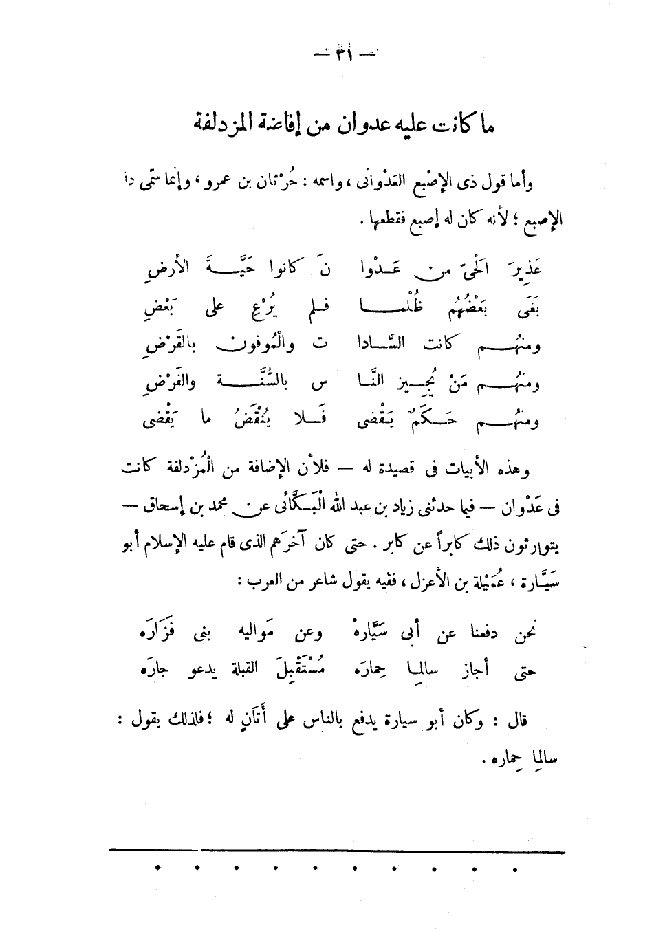 وهذه الأبيات فى قصيدة له- فلأن الإضافة مِنْ الْمُزْدَلِفَةِ كَانَتْ فِي عَدْوَانَ- فِيمَا حَدّثَنِي زياد بن عبد الله البكائي عن محمد بْنِ إسْحَاقَ- يَتَوَارَثُونَ ذَلِكَ كَابِرًا عَنْ كَابِرٍ. حَتّى كَانَ آخِرَهُمْ الّذِي قَامَ عَلَيْهِ الْإِسْلَامُ أَبُو سَيّارَةَ، عُمَيْلَةُ بْنُ الْأَعْزَلِ، فَفِيهِ يَقُولُ شَاعِرٌ مِنْ الْعَرَبِ: