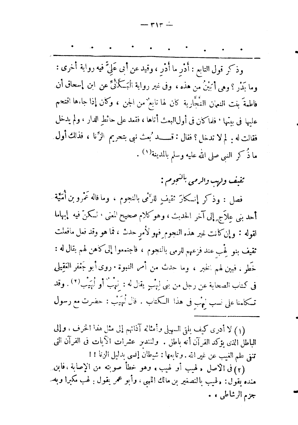 فَصْلٌ: وَذَكَرَ إنْكَارَ ثَقِيفٍ لِلرّمْيِ بِالنّجُومِ، وَمَا قَالَهُ عَمْرُو بْنُ أُمَيّةَ أَحَدُ بَنِي عِلَاجٍ إلَى آخِرِ الْحَدِيثِ، وَهُوَ كَلَامٌ صَحِيحُ الْمَعْنَى، لَكِنّ فِيهِ إبْهَامًا لِقَوْلِهِ: وَإِنْ كَانَتْ غَيْرَ هَذِهِ النّجُومُ فَهُوَ لِأَمْرِ حَدَثَ، فَمَا هُوَ وَقَدْ فَعَلَ مَا فَعَلَتْ ثَقِيفٌ بَنُو لِهْبٍ عِنْدَ فَزَعِهِمْ لِلرّمْيِ بِالنّجُومِ، فَاجْتَمَعُوا إلَى كَاهِنٍ لَهُمْ يُقَالُ لَهُ: