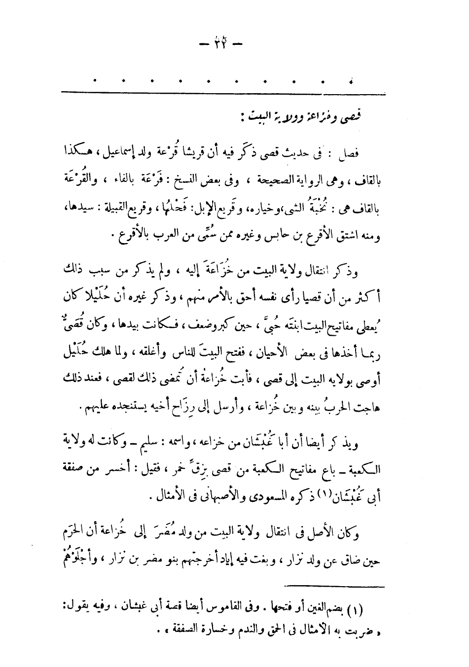 فَصْلٌ: فِي حَدِيثِ قُصَيّ ذَكَرَ فِيهِ أَنّ قُرَيْشًا قُرْعَةُ وَلَدِ إسْمَاعِيلَ، هَكَذَا بِالْقَافِ، وَهِيَ الرّوَايَةُ الصّحِيحَةُ، وَفِي بَعْضِ النّسَخِ: فَرْعَةُ بِالْفَاءِ، وَالْقُرْعَةُ بِالْقَافِ هِيَ: نخبة الشى، وَخِيَارُهُ، وَقَرِيعُ الْإِبِلِ: فَحْلُهَا، وَقَرِيعُ الْقَبِيلَةِ: سَيّدُهَا، وَمِنْهُ اُشْتُقّ الْأَقْرَعُ بْنُ حَابِسٍ وَغَيْرُهُ مِمّنْ سُمّيَ مِنْ الْعَرَبِ بِالْأَقْرَعِ.